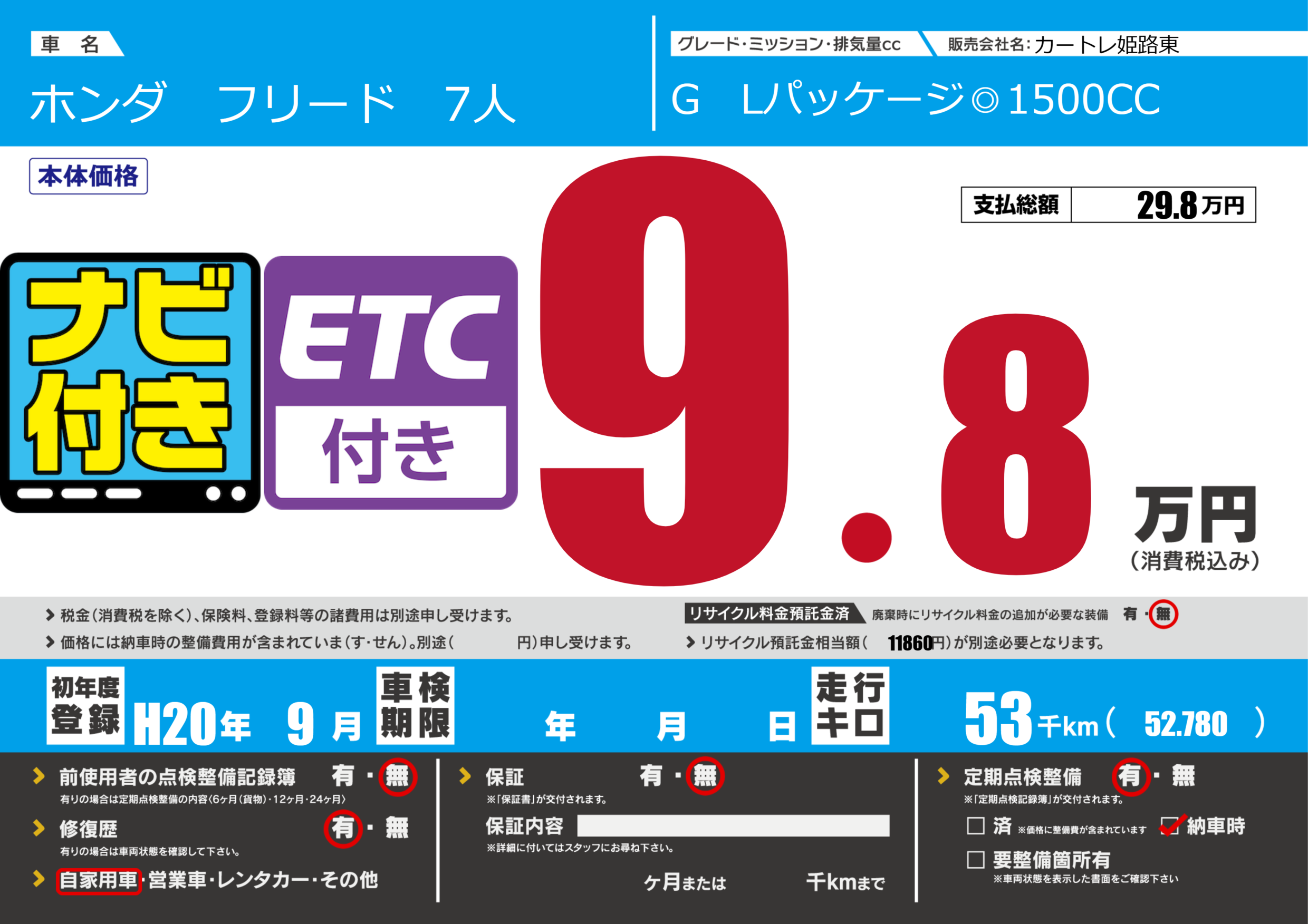 | 車名 | ホンダ フリード 7人 | グレード ミッション 排気量 |