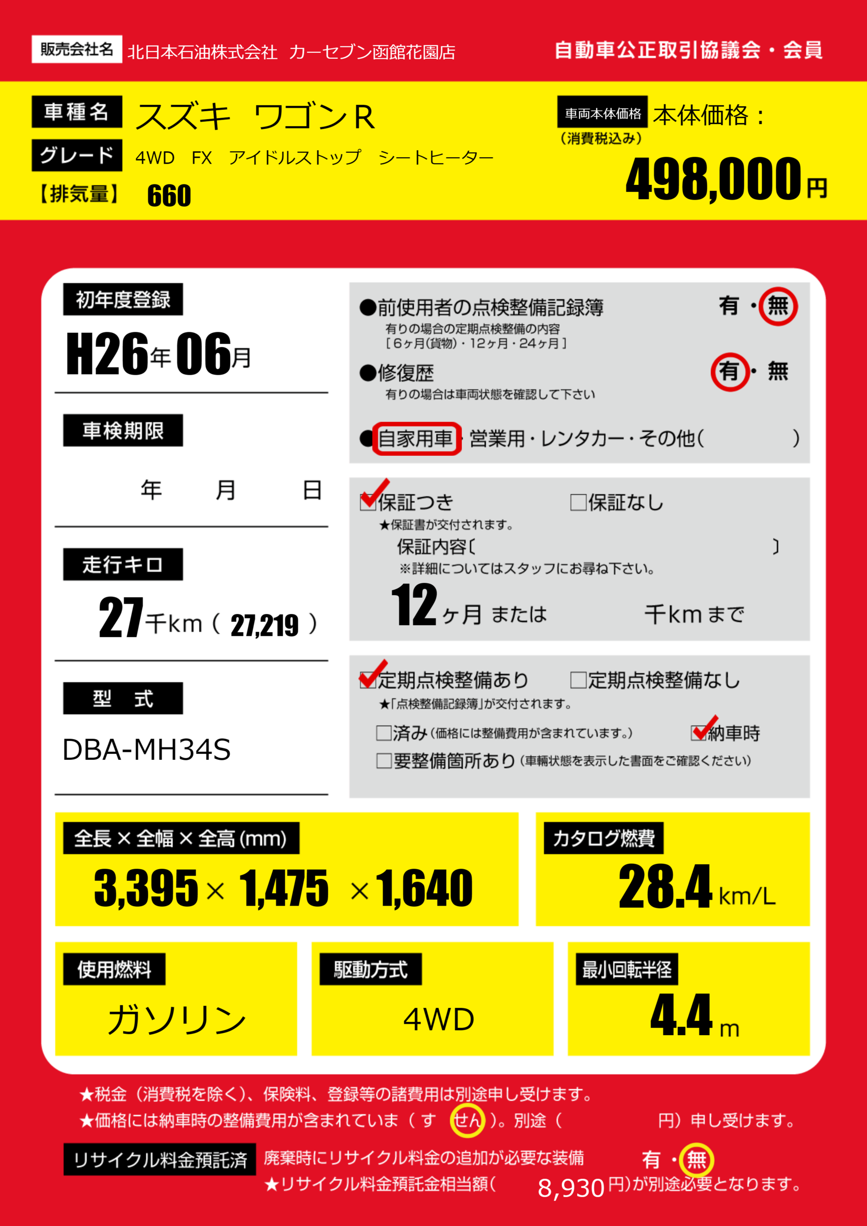 | 車名 | スズキ ワゴンR | グレード ミッション 排気量 |