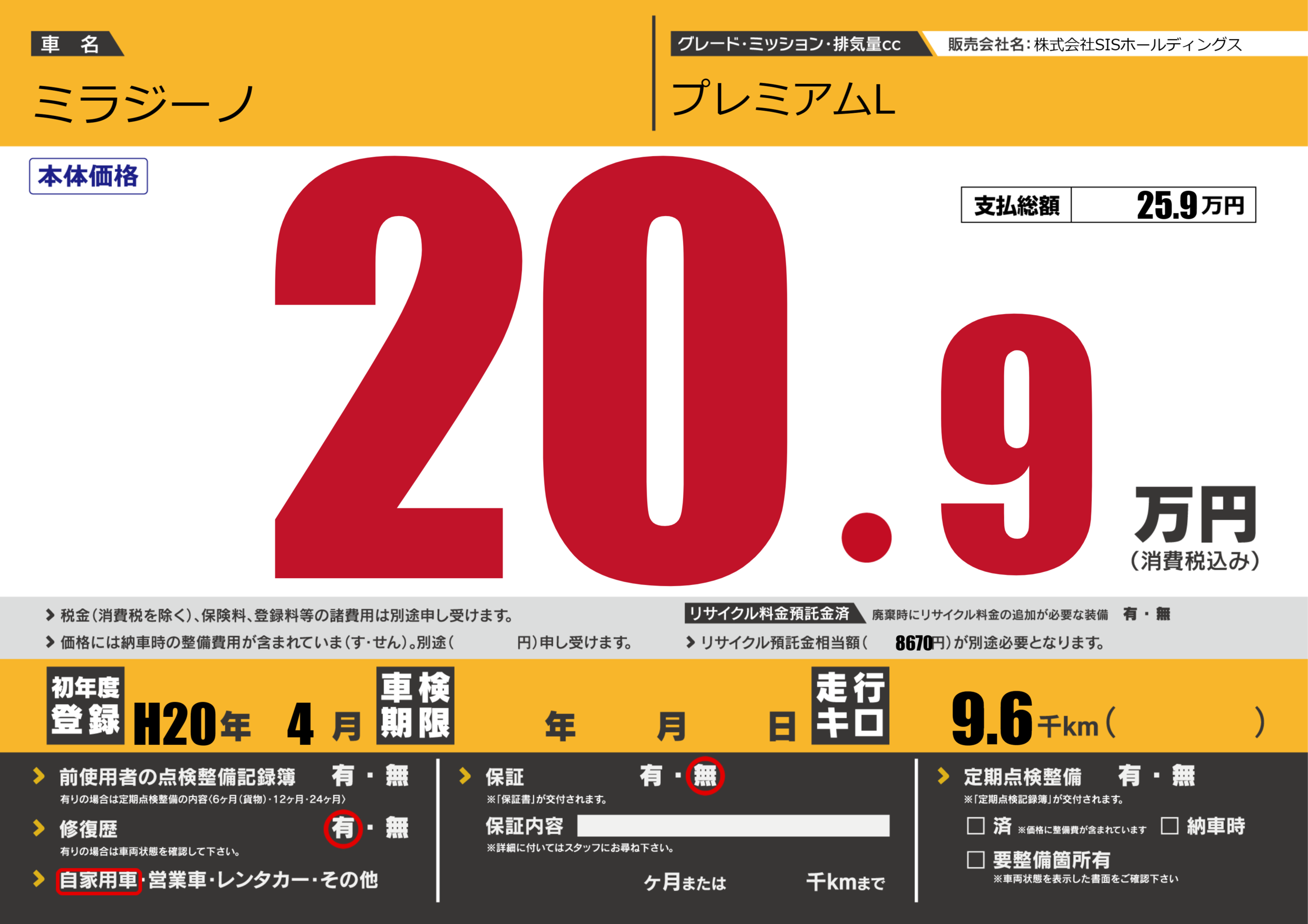| 走行キロ | 0.9万km | 初年度登録 | H20年4月 |