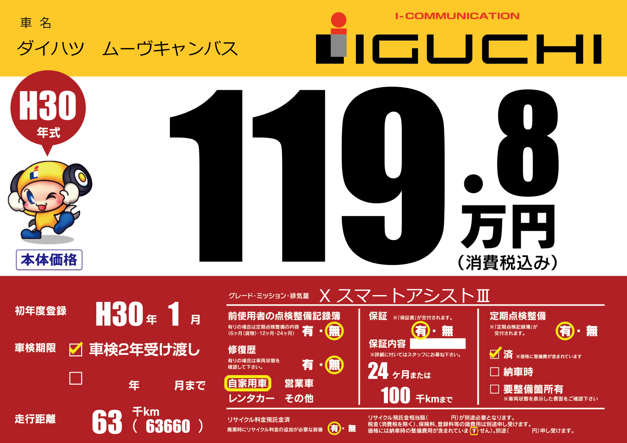 | 走行キロ | 6.3万km | 初年度登録 | H30年1月 |