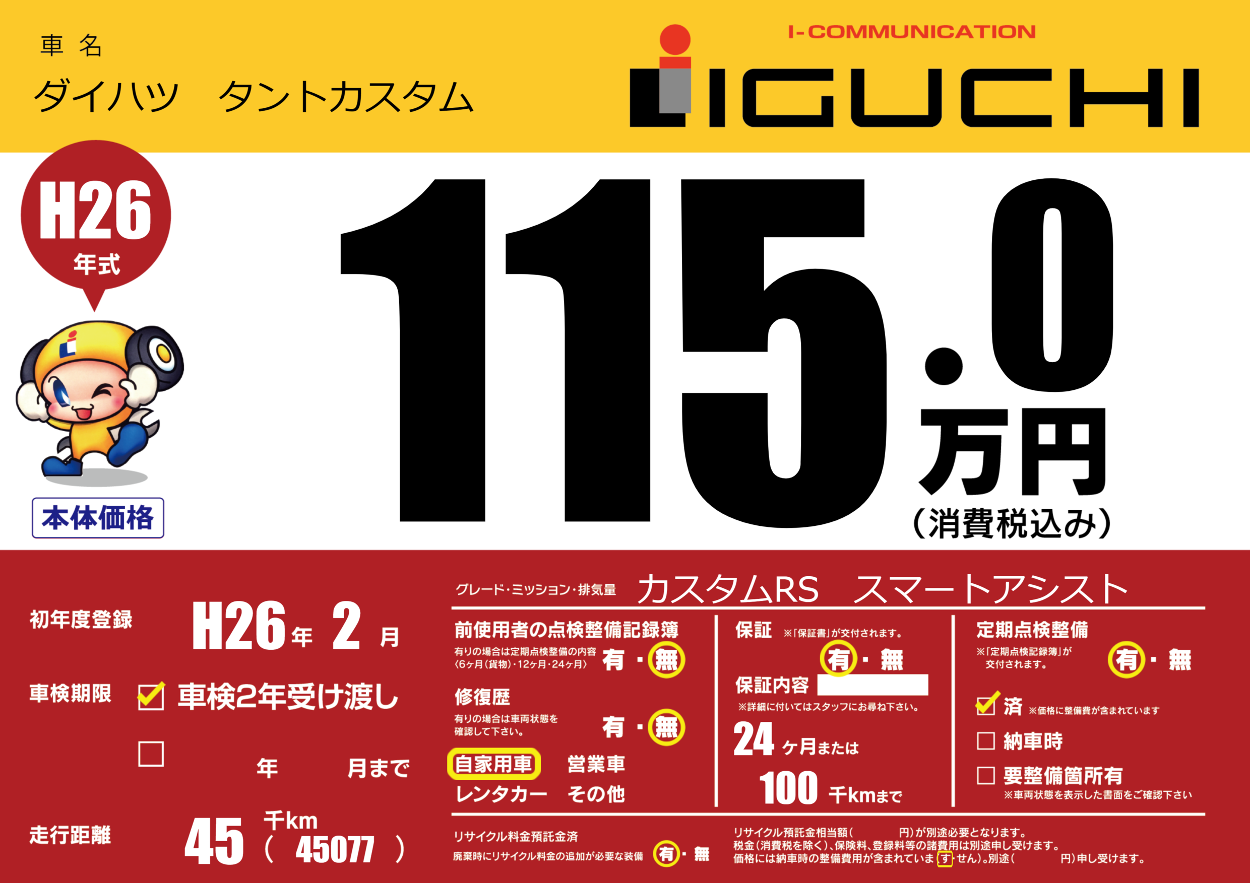| 走行キロ | 4.5万km | 初年度登録 | H26年2月 |