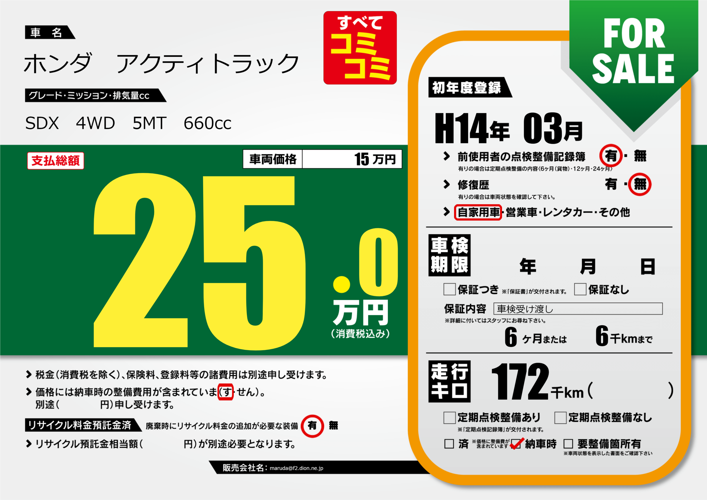 保証なし 保証内容(車検受け渡し) 6ヶ月または(6)千kmまで |