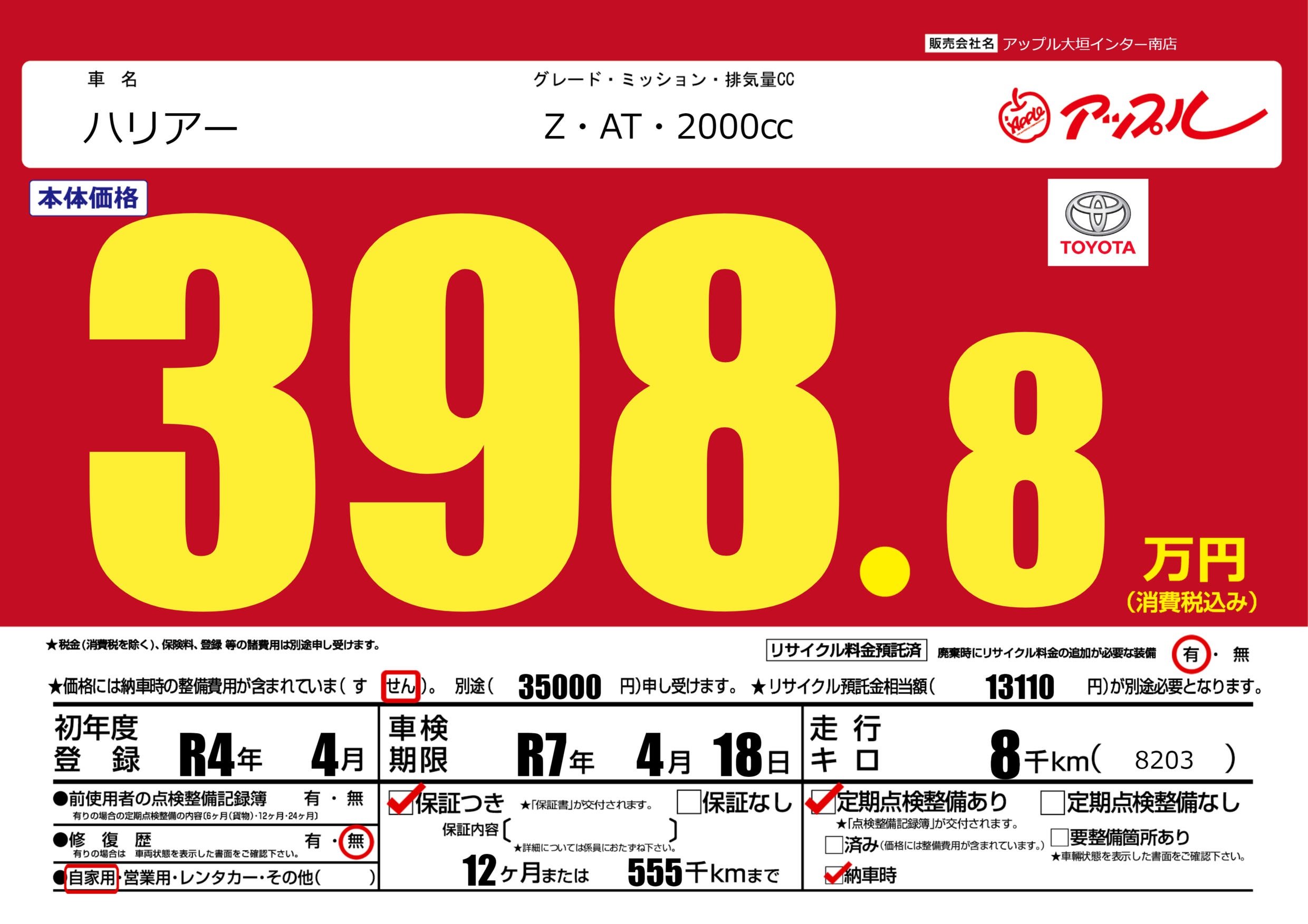 | 車名 | ハリアー | グレード ミッション 排気量 |