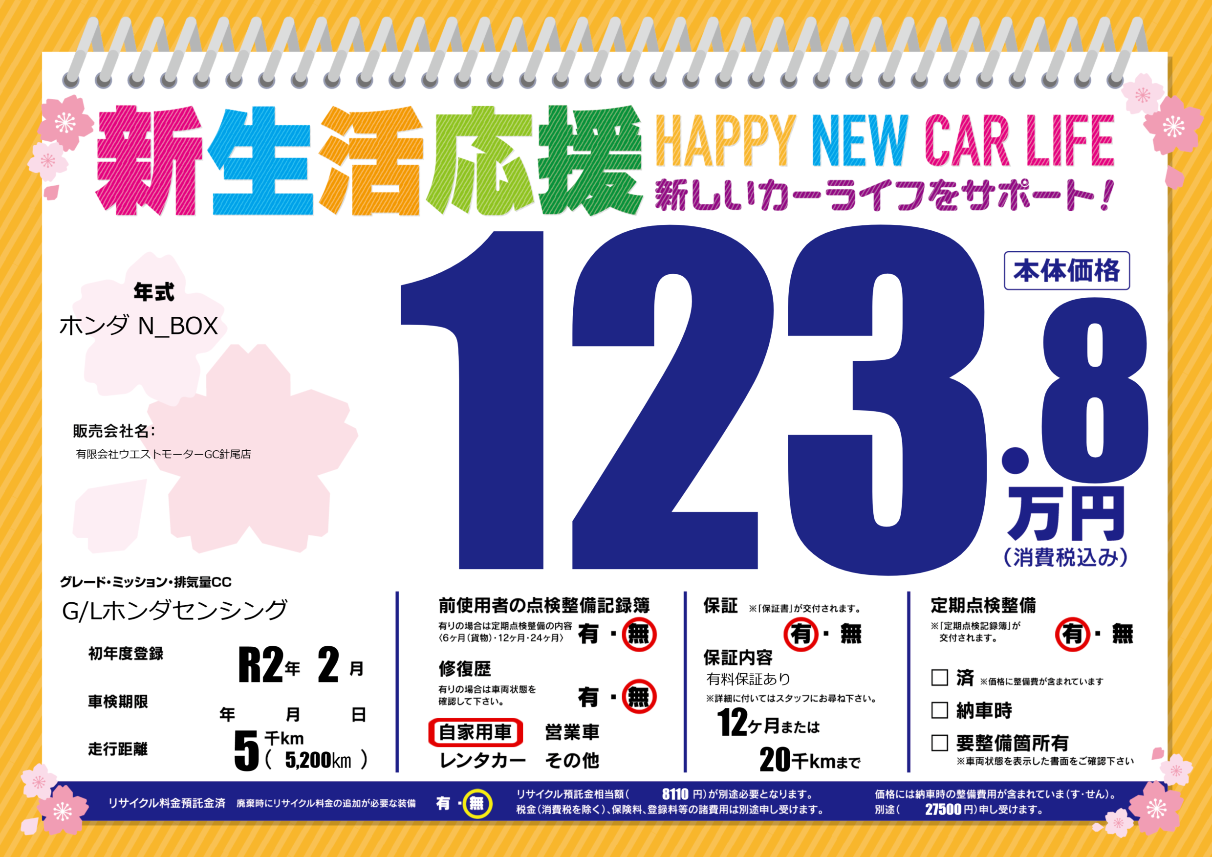 保証付き 保証内容(有料保証あり) 12ヶ月または(20)千kmまで |
