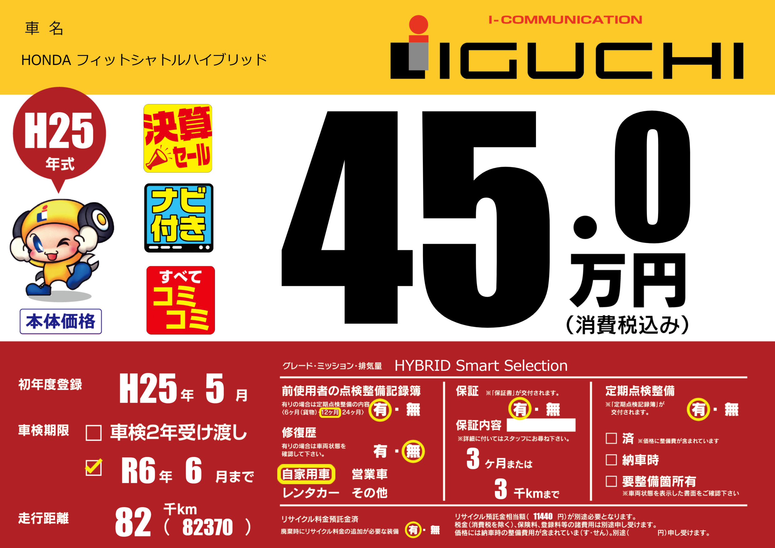 | 車名 | HONDA フィットシャトルハイブリッド | グレード ミッション 排気量 |