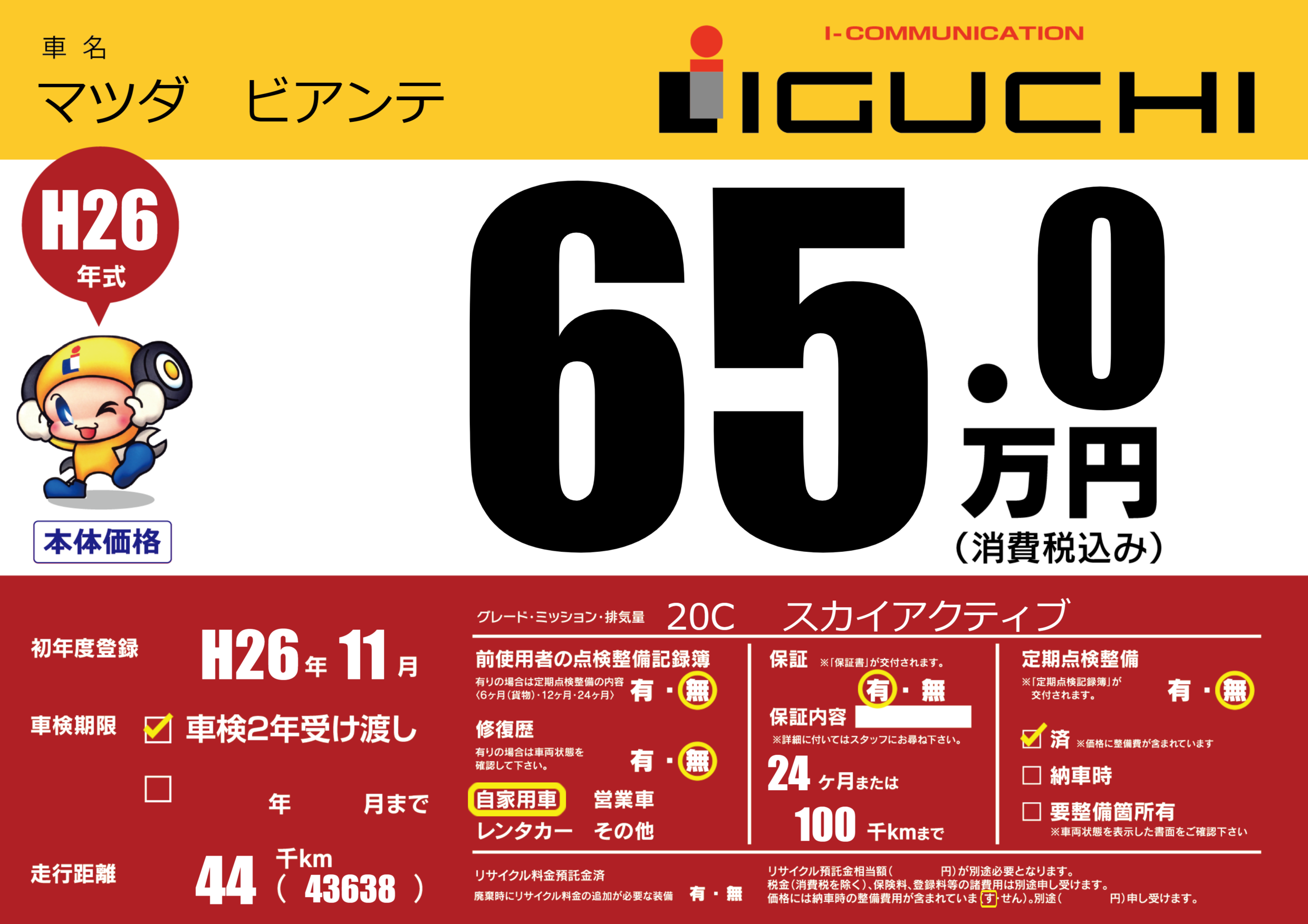 | 車名 | マツダ ビアンテ | グレード ミッション 排気量 |