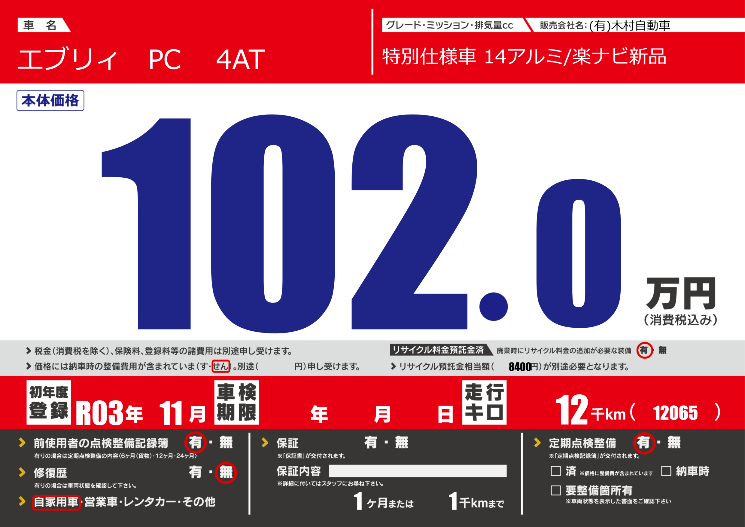 保証なし 保証内容(---) 1ヶ月または(1)千kmまで |