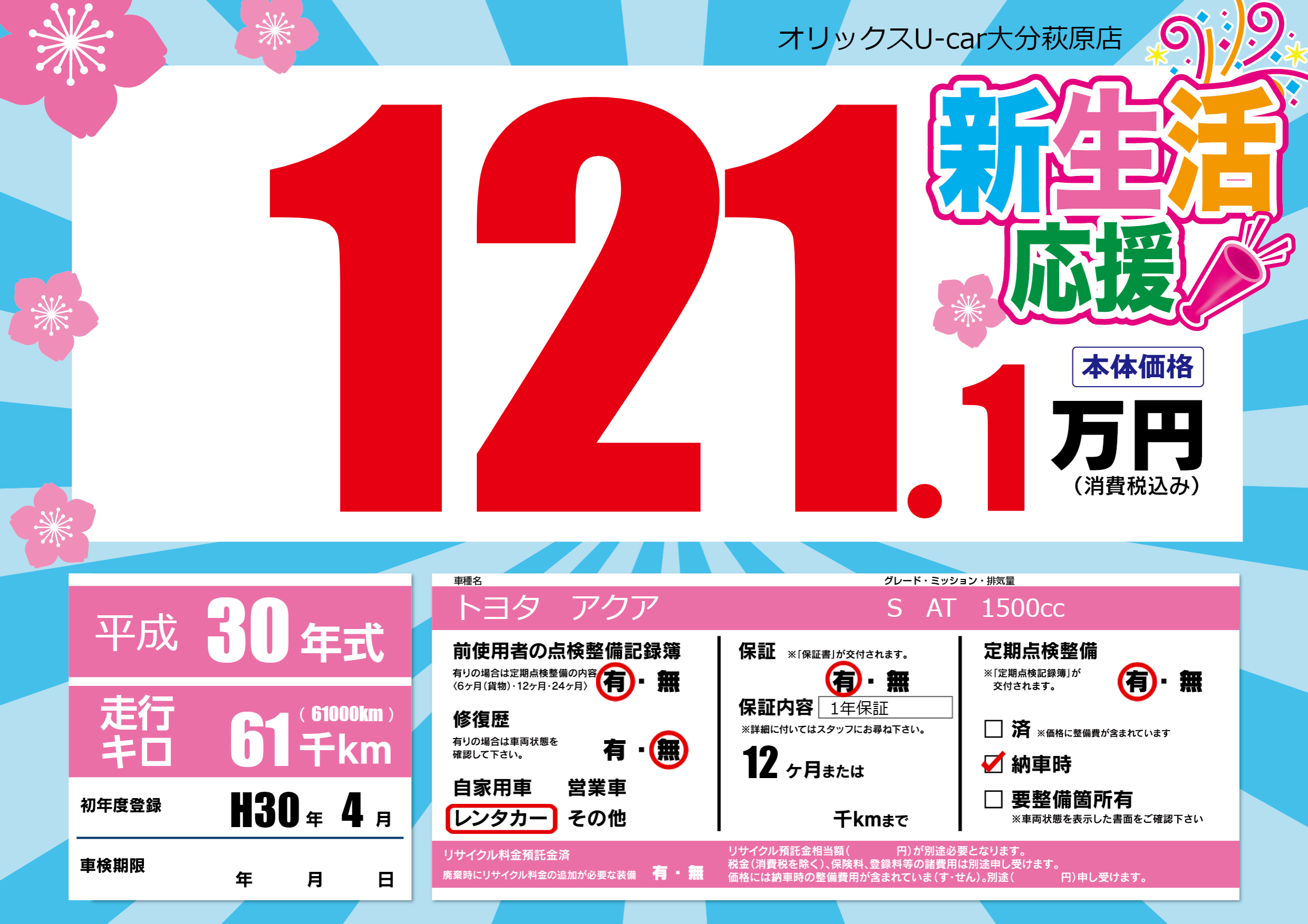 | 車名 | トヨタ アクア | グレード ミッション 排気量 |