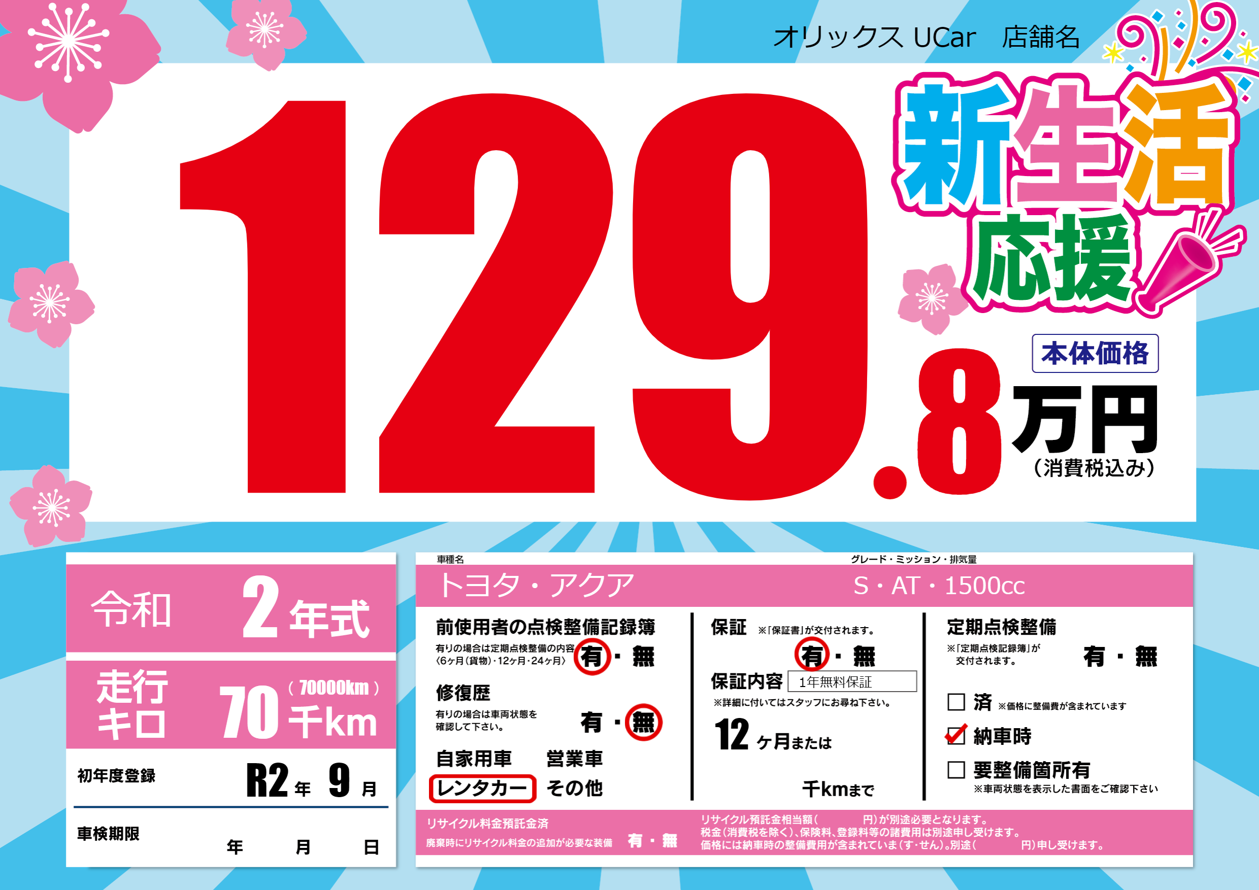 | 車名 | トヨタ・アクア | グレード ミッション 排気量 |