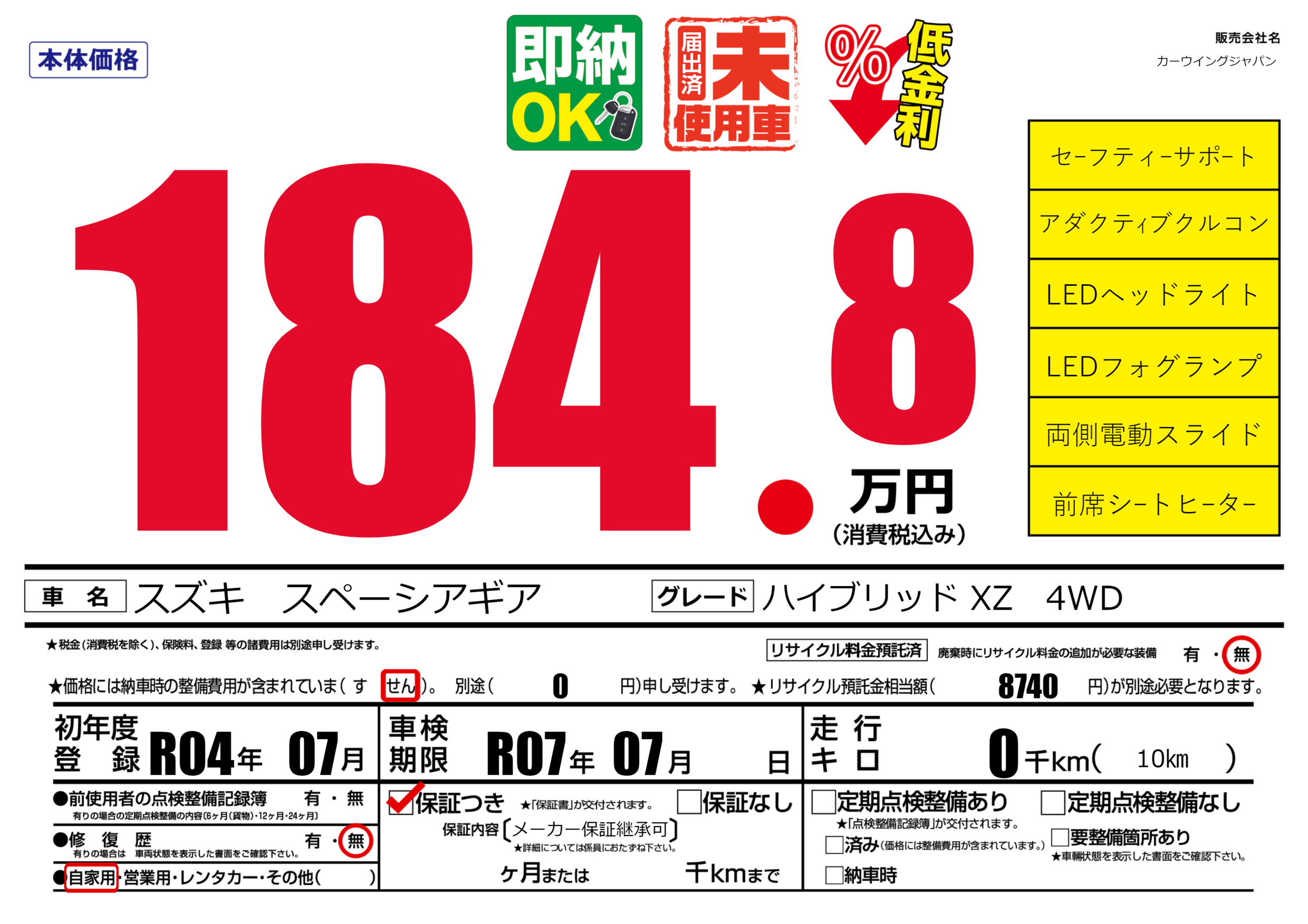 | 車名 | スズキ スペーシアギア | グレード ミッション 排気量 |