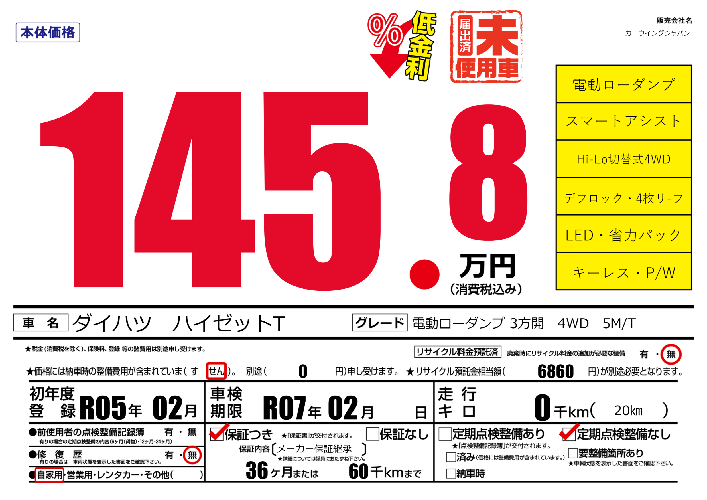 | 車名 | ダイハツ ハイゼットT | グレード ミッション 排気量 |