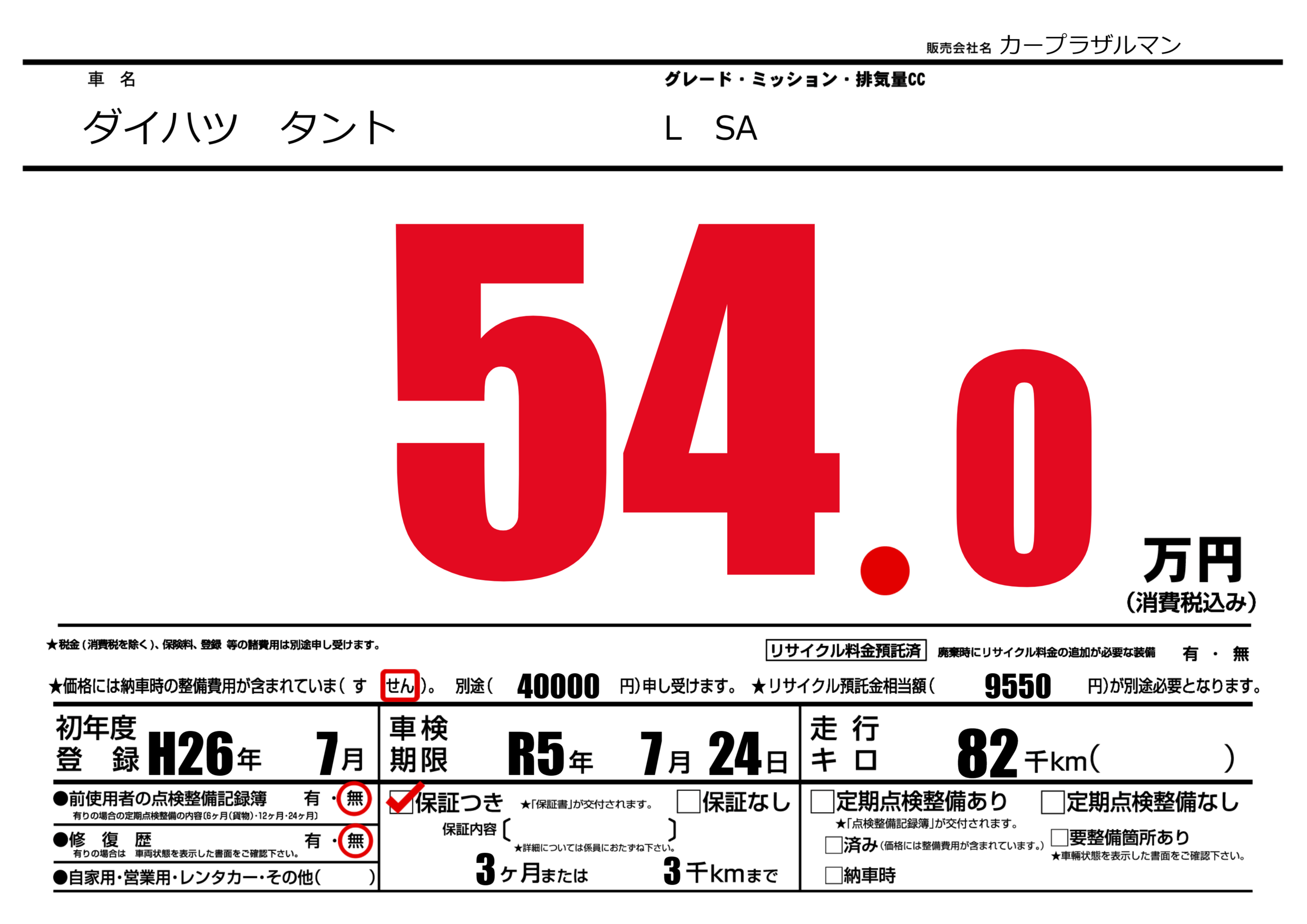 | 車名 | ダイハツ タント | グレード ミッション 排気量 |