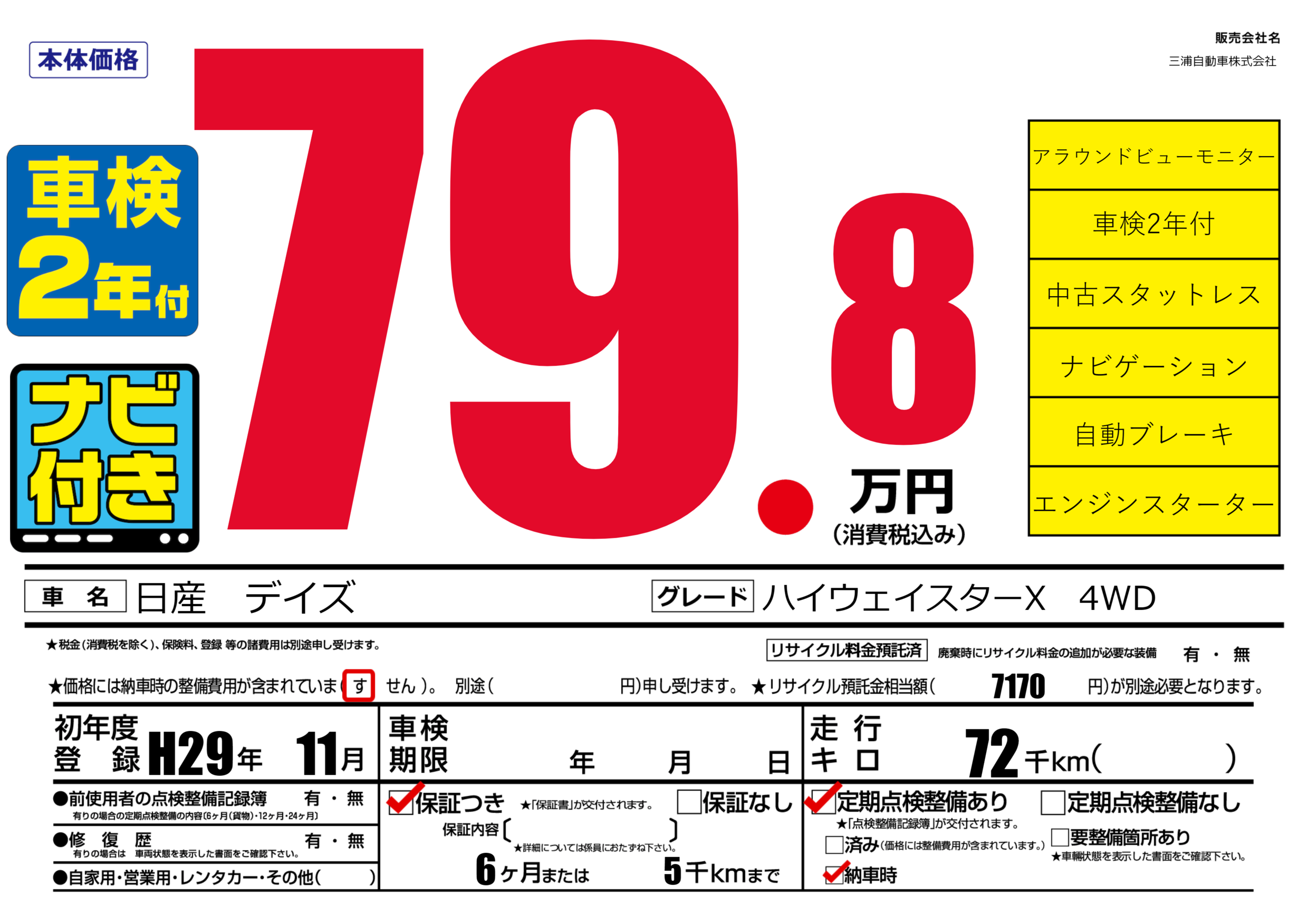 | 車名 | 日産 デイズ | グレード ミッション 排気量 |