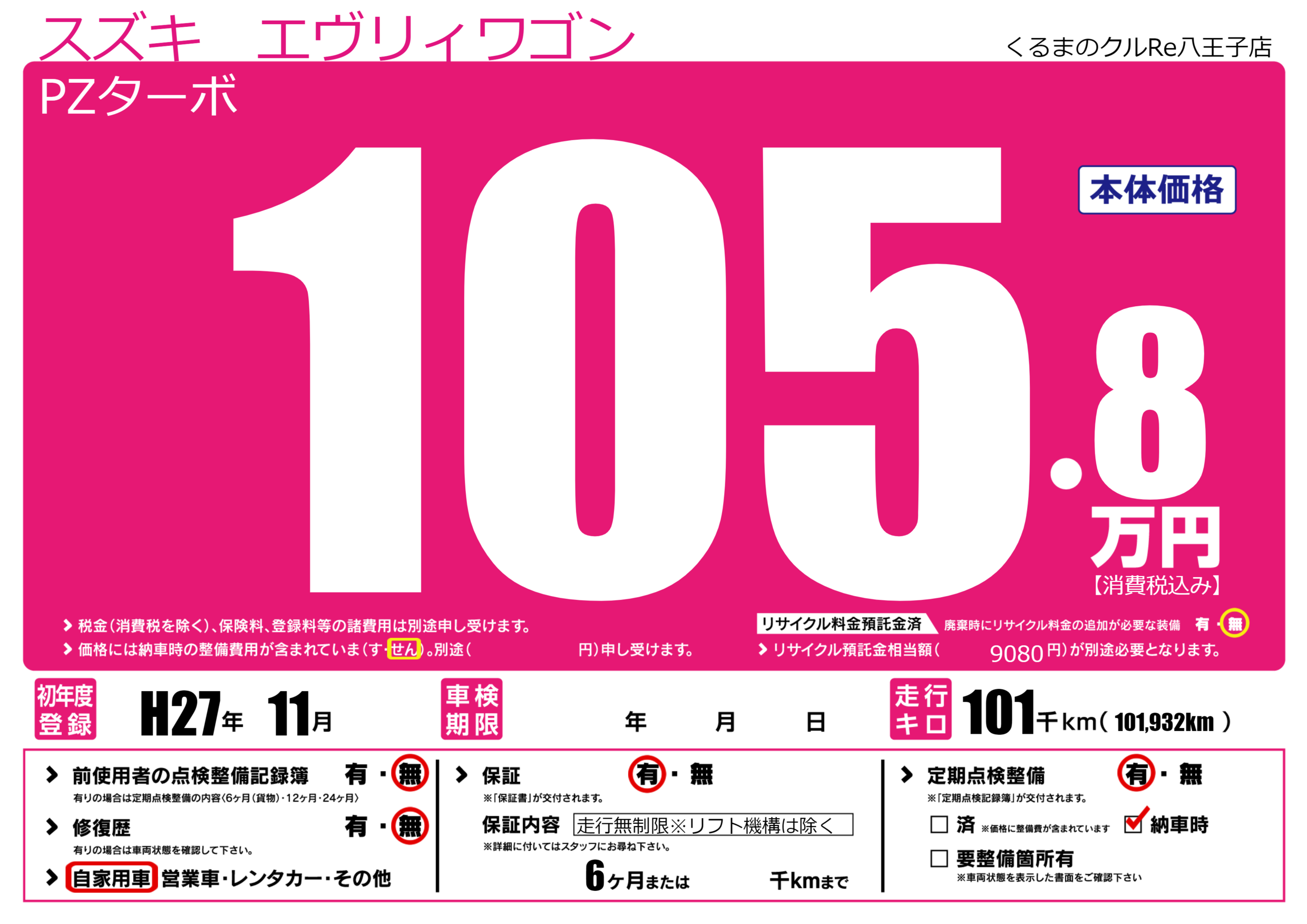 | 車名 | スズキ エヴリィワゴン | グレード ミッション 排気量 |