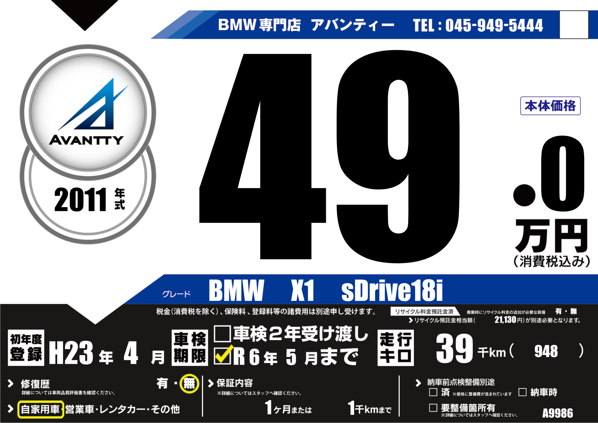 | 走行キロ | 3.9万km | 初年度登録 | H23年4月 |