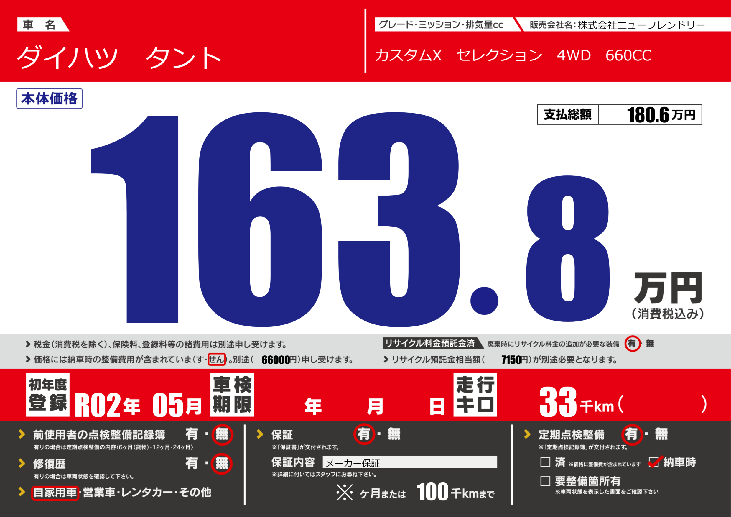 | 定期点検整備 | 定期点検整備あり 納車時あり | ||