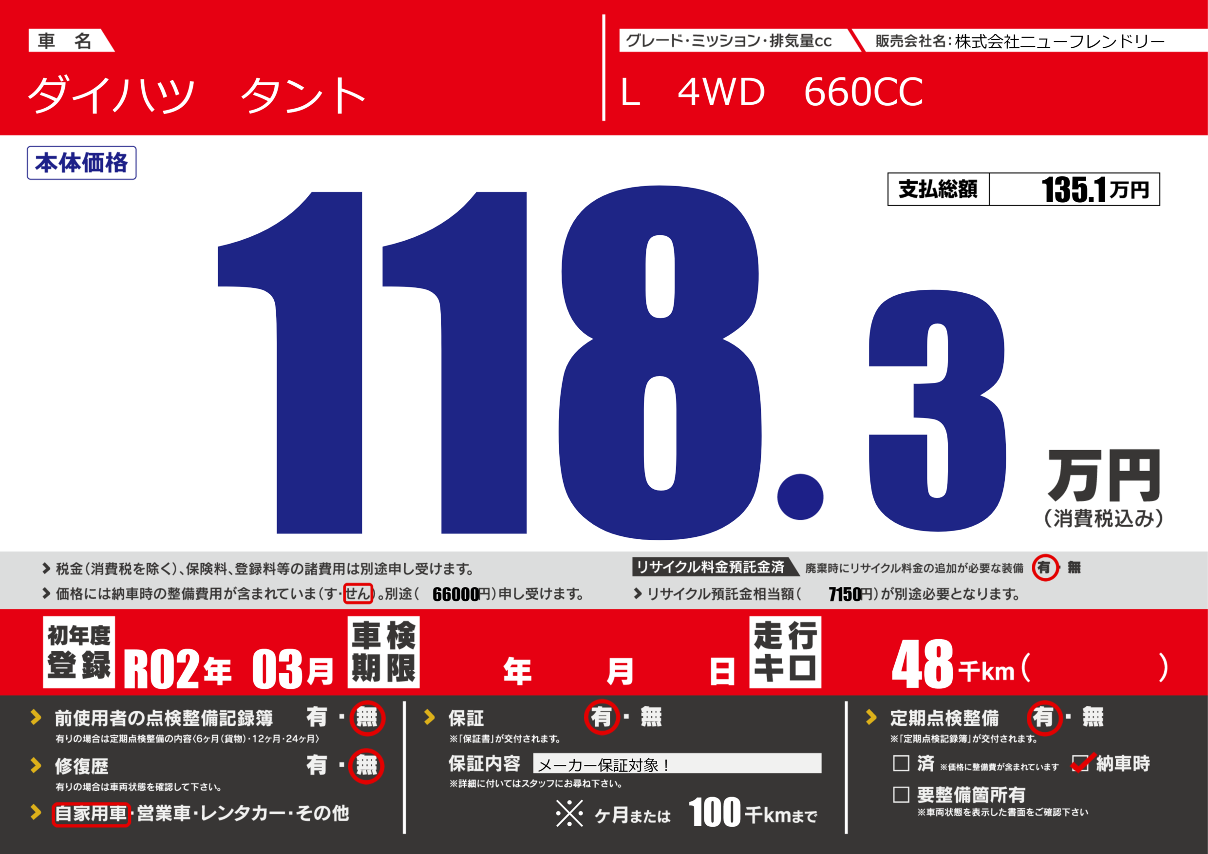 | 定期点検整備 | 定期点検整備あり 納車時あり | ||