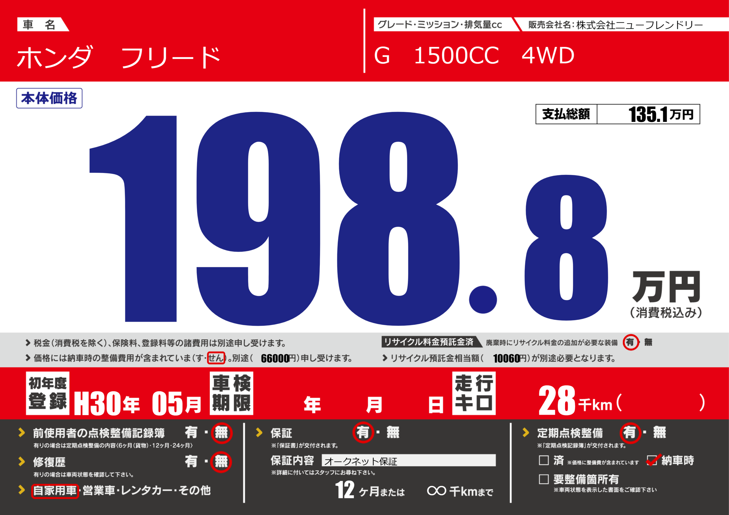 | 車名 | ホンダ フリード | グレード ミッション 排気量 |