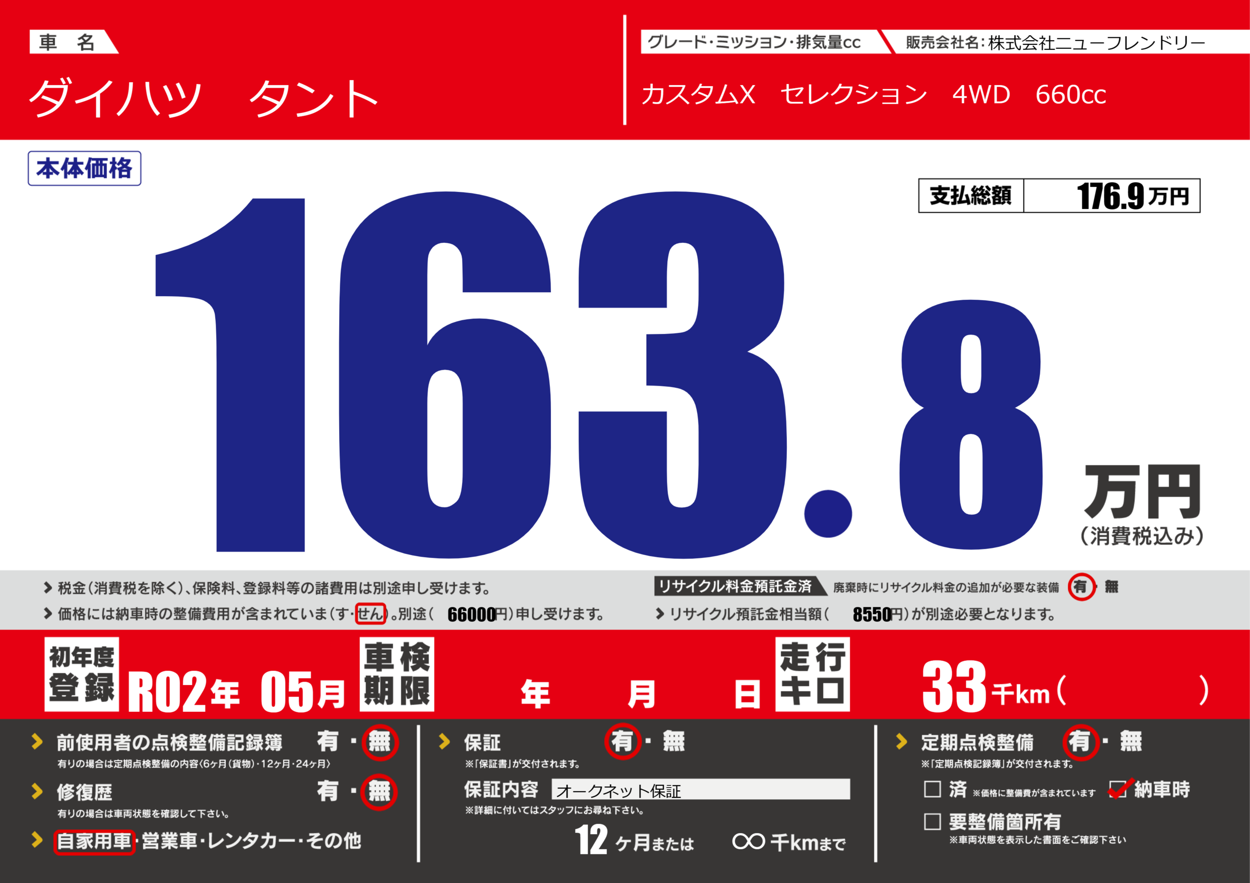 | 車名 | ダイハツ タント | グレード ミッション 排気量 |