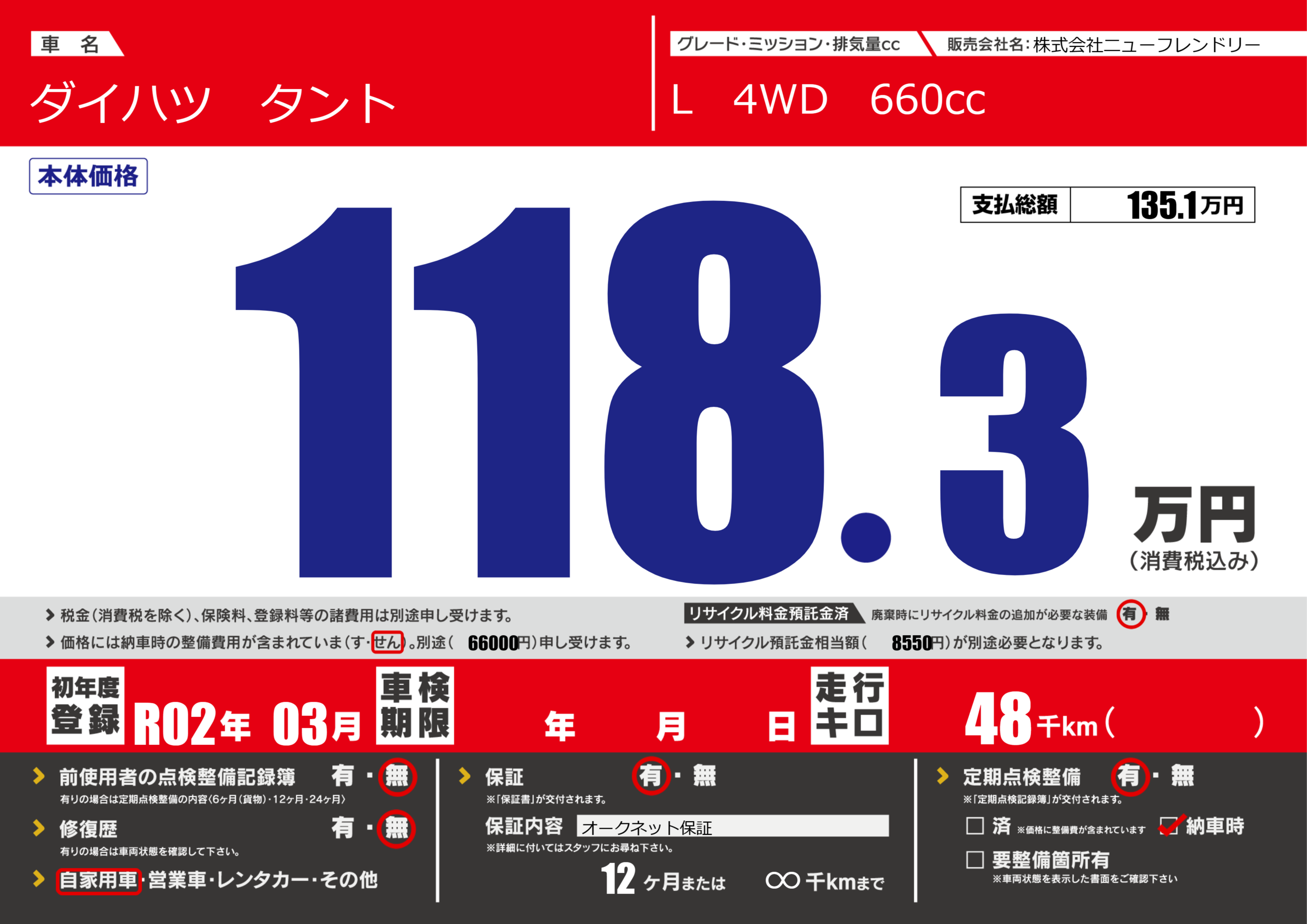 | 車名 | ダイハツ タント | グレード ミッション 排気量 |