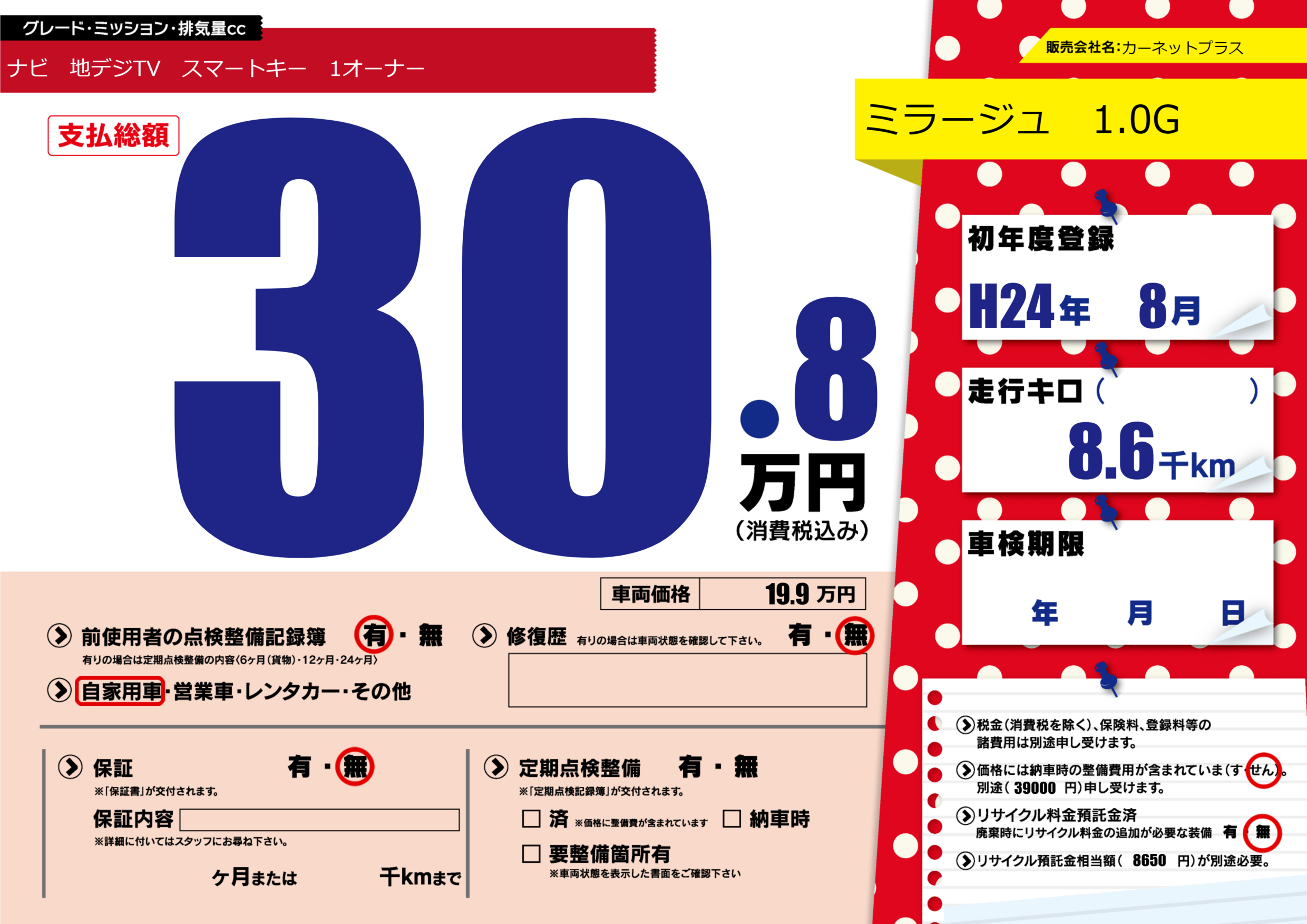 | 車名 | ミラージュ 1.0G | グレード ミッション 排気量 |