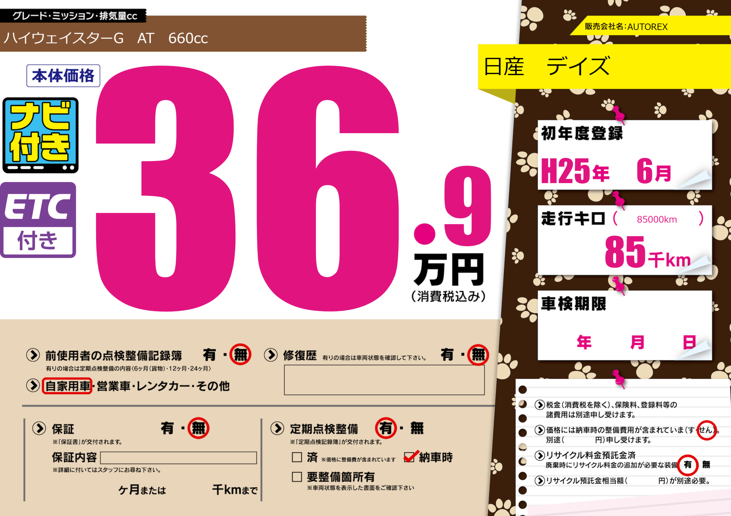 | 車名 | 日産 デイズ | グレード ミッション 排気量 |