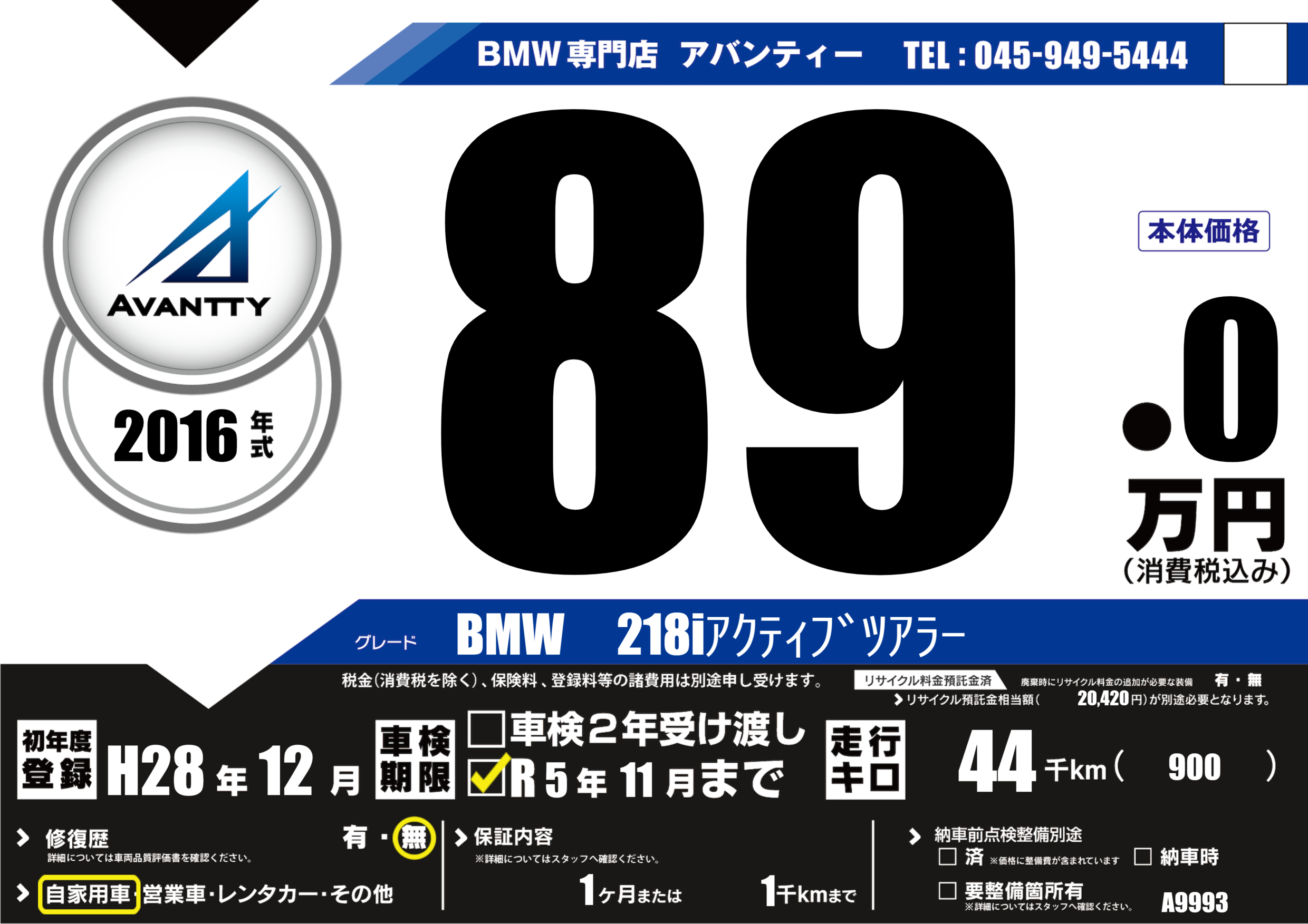 | 走行キロ | 4.4万km | 初年度登録 | H28年12月 |