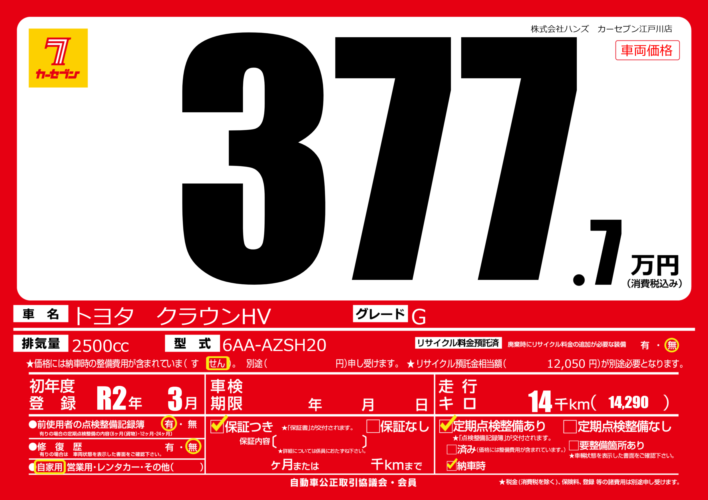 | 車名 | トヨタ クラウンHV | グレード ミッション 排気量 |