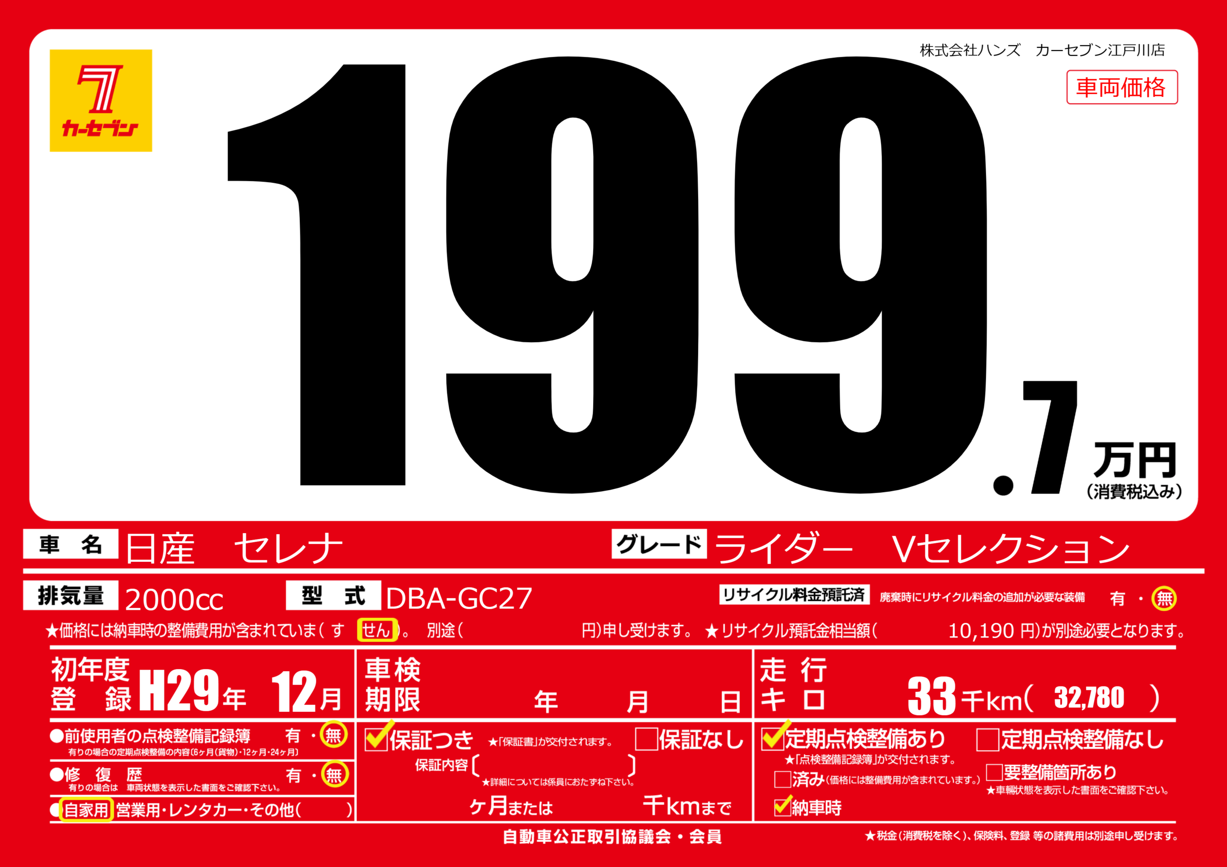 | 車名 | 日産 セレナ | グレード ミッション 排気量 |