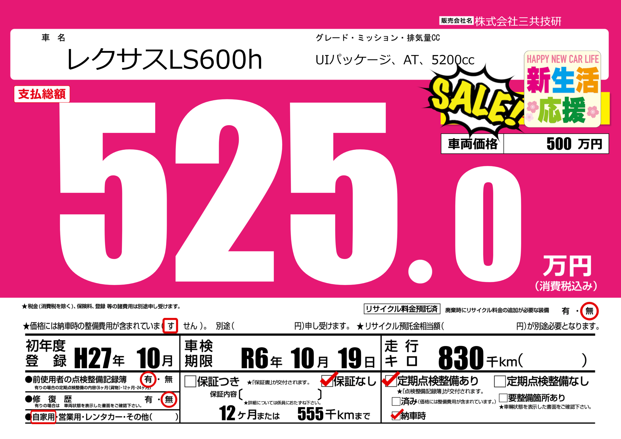 | 車名 | レクサスLS600h | グレード ミッション 排気量 |