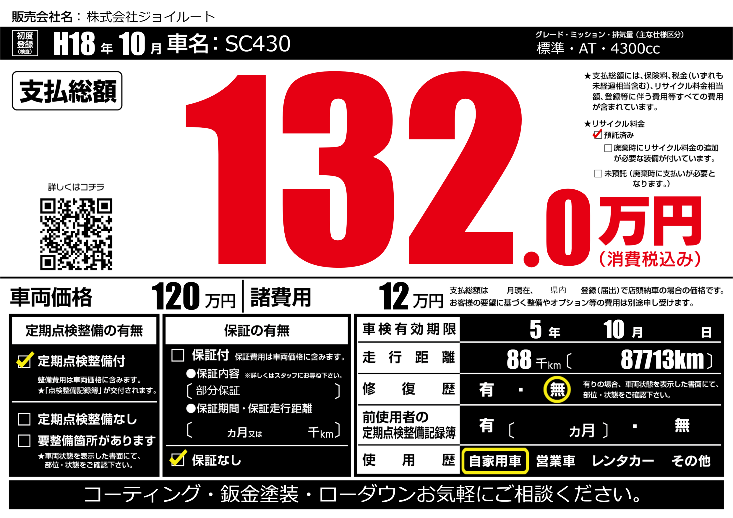 | 車名 | SC430 | グレード ミッション 排気量 |