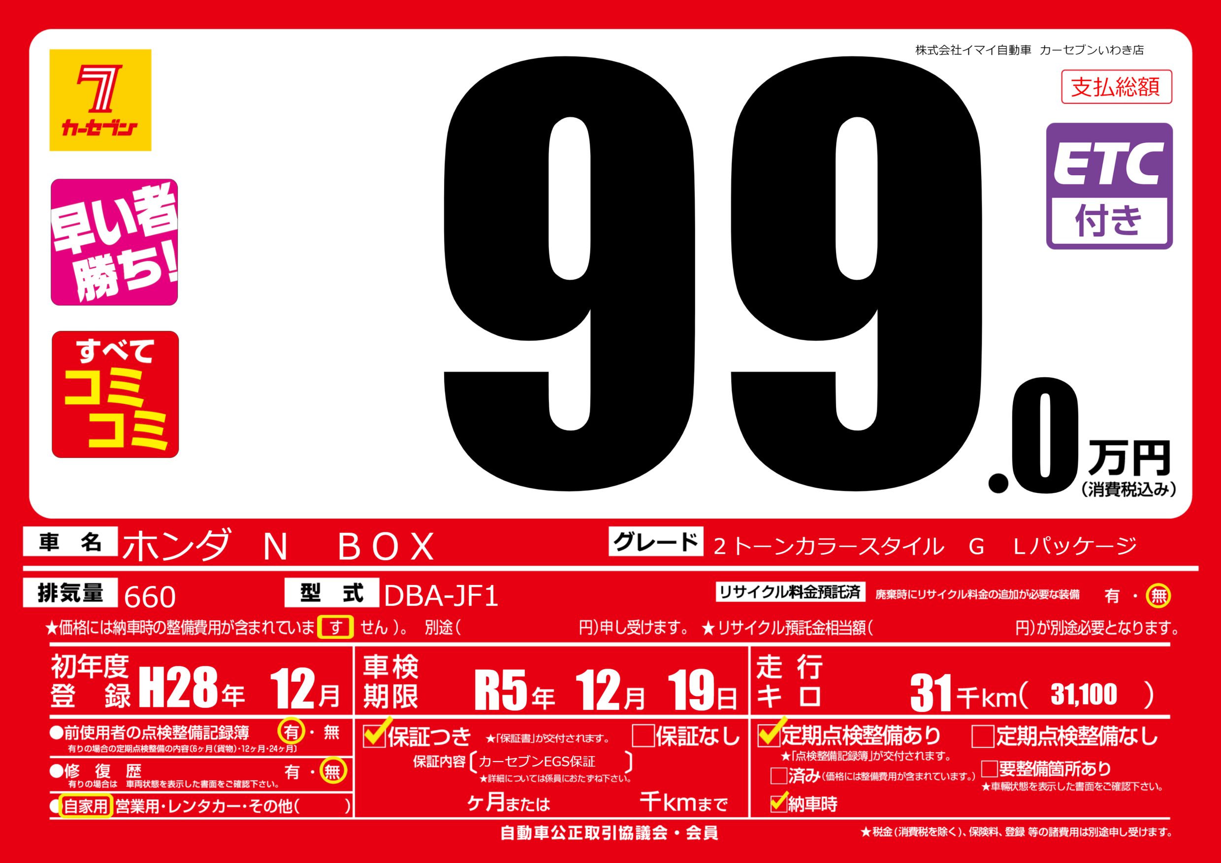 保証付き 保証内容(カーセブンEGS保証) ヶ月または千km |
