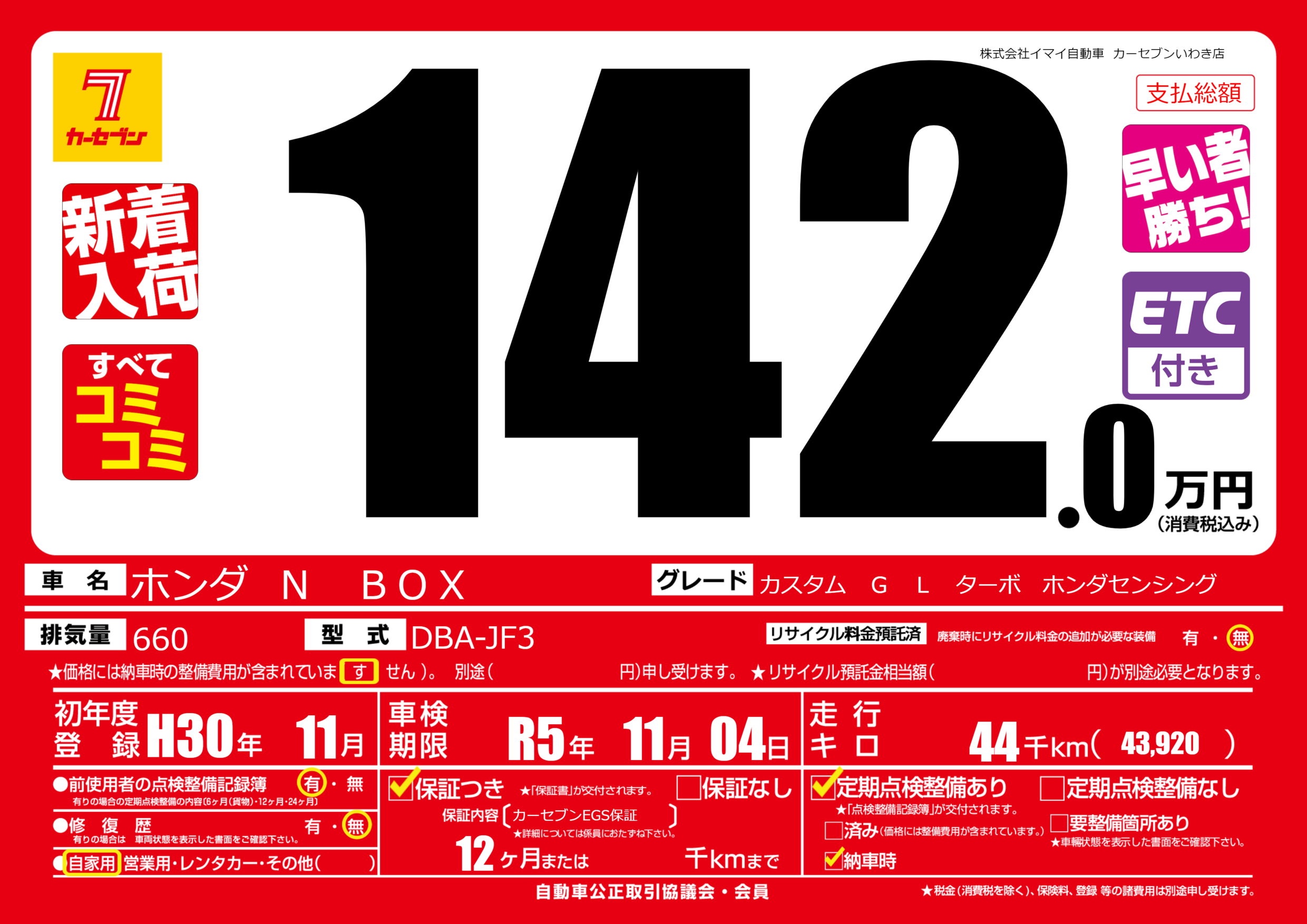 | 走行キロ | 4.4万km | 初年度登録 | H30年11月 |