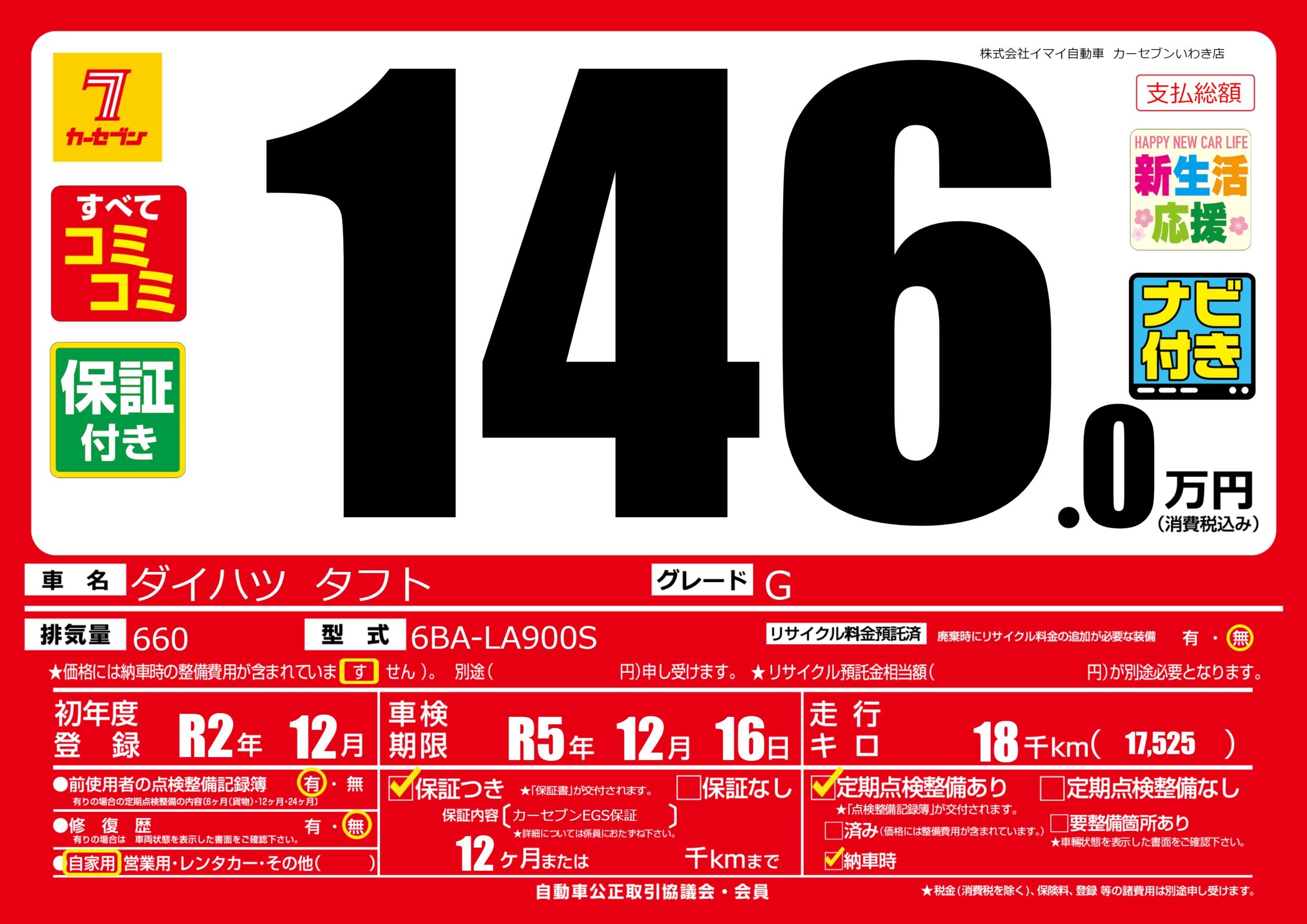 | 車名 | ダイハツ タフト | グレード ミッション 排気量 |