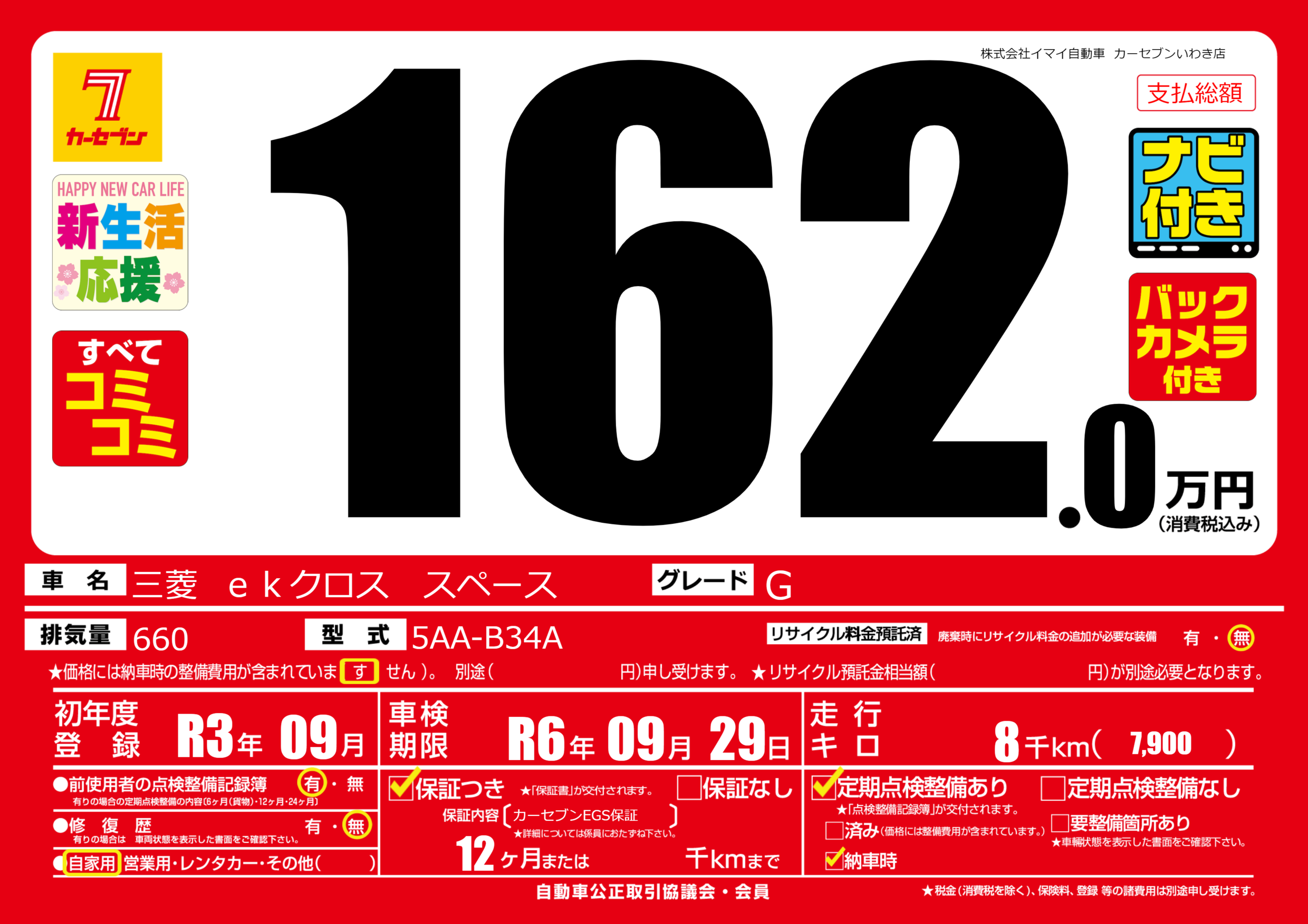 | 車名 | 三菱 ekクロス スペース | グレード ミッション 排気量 |