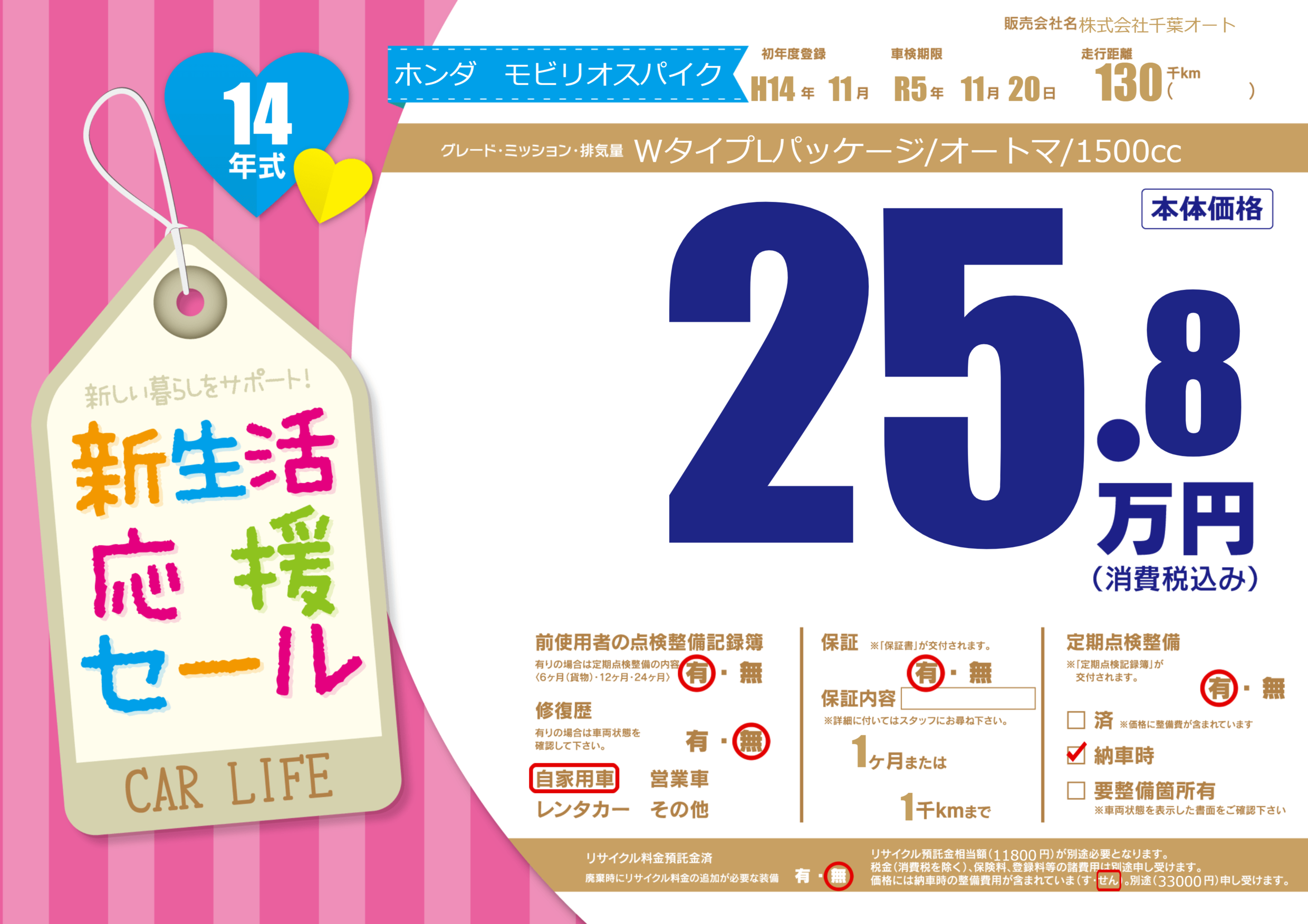 | 定期点検整備 | 定期点検整備あり 納車時あり | ||