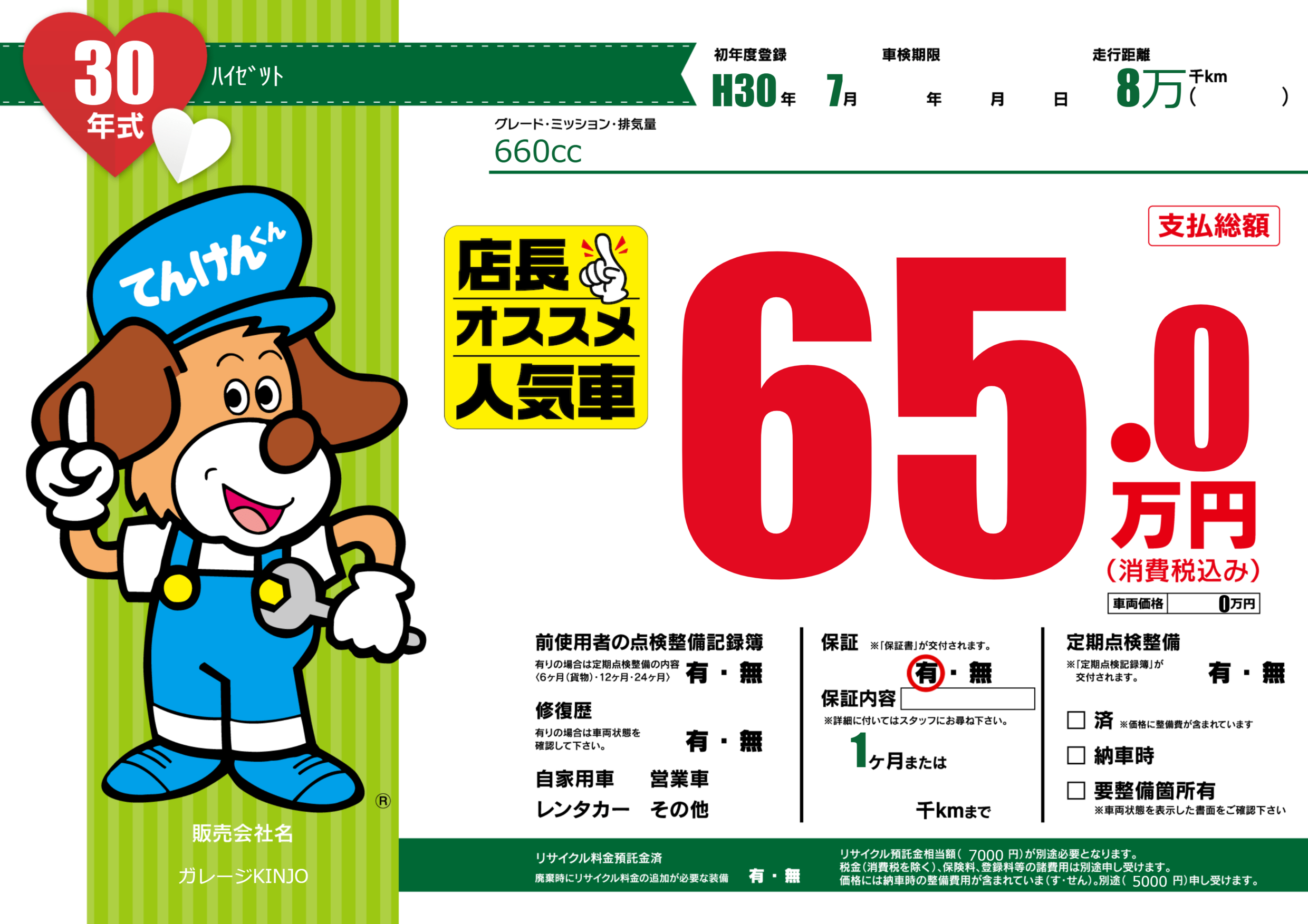 保証付き 保証内容(---) 1ヶ月または()千kmまで |