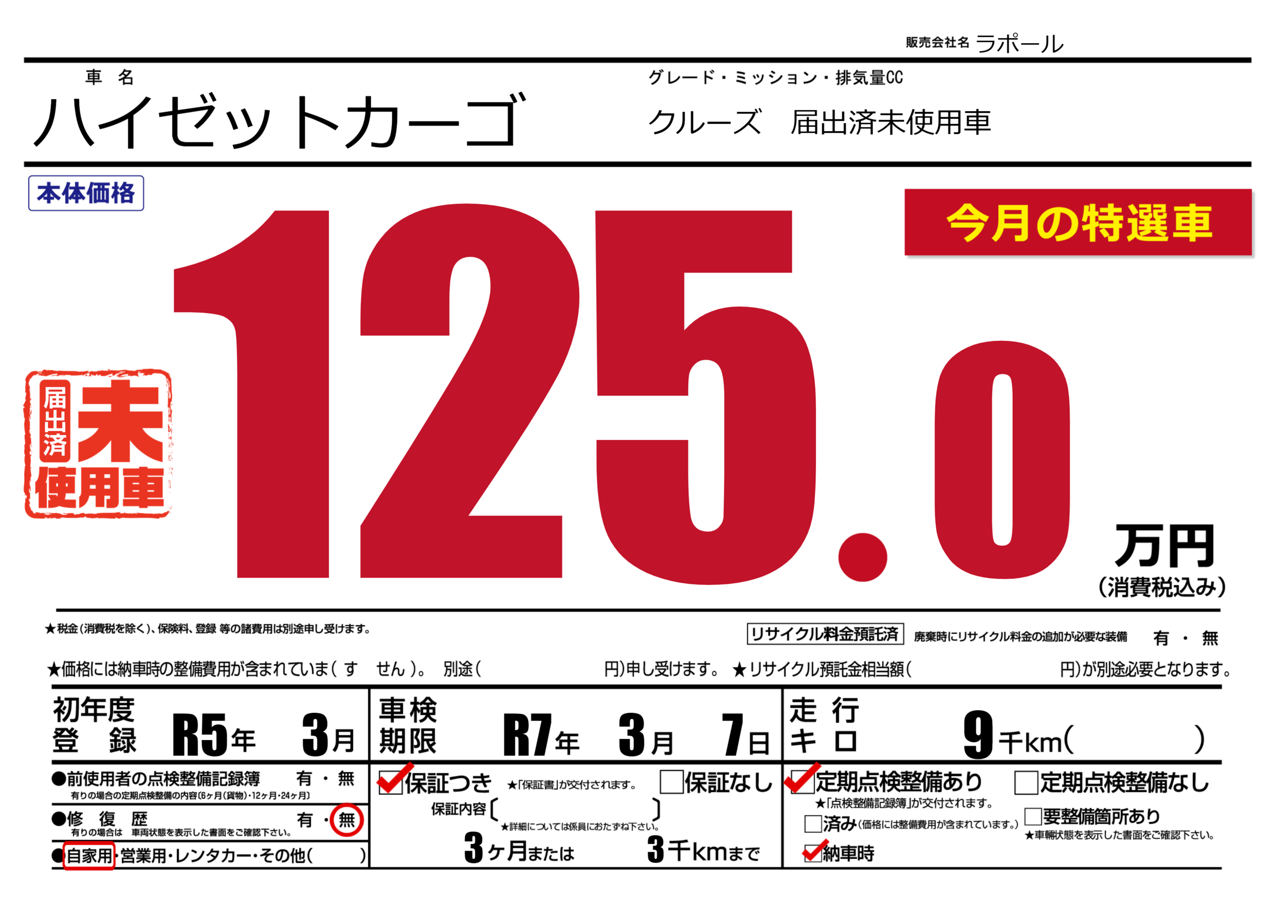 | 走行キロ | 0.9万km | 初年度登録 | R5年3月 |