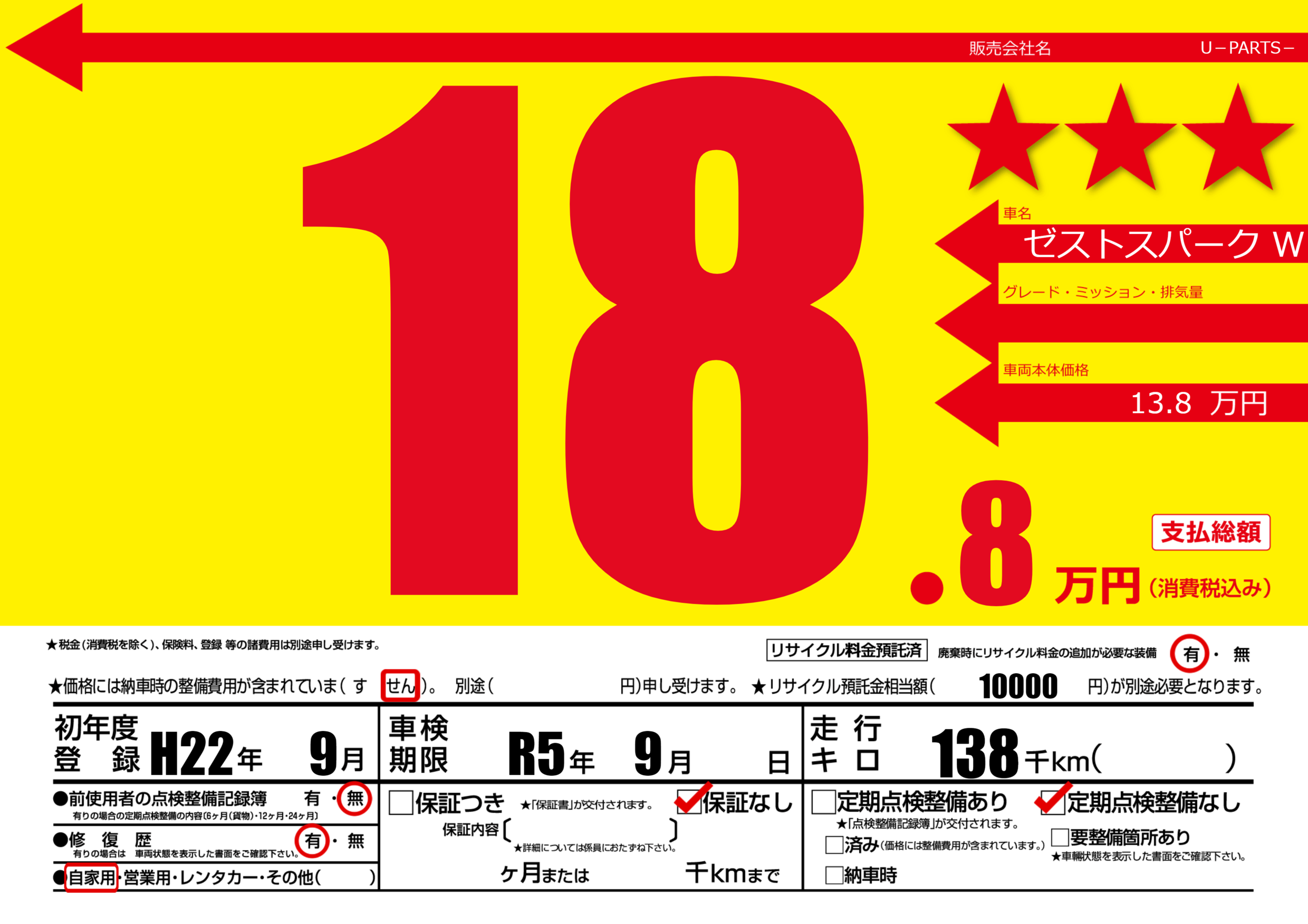 | 走行キロ | 13.8万km | 初年度登録 | H22年9月 |