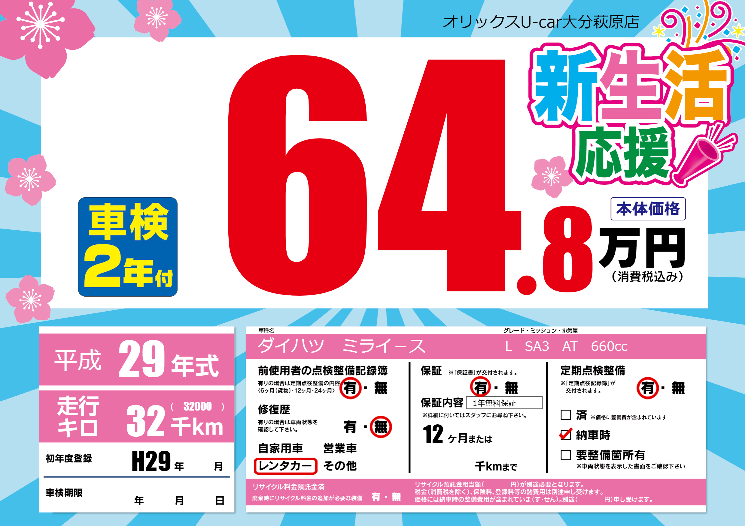 保証付き 保証内容(1年無料保証) 12ヶ月または()千kmまで |