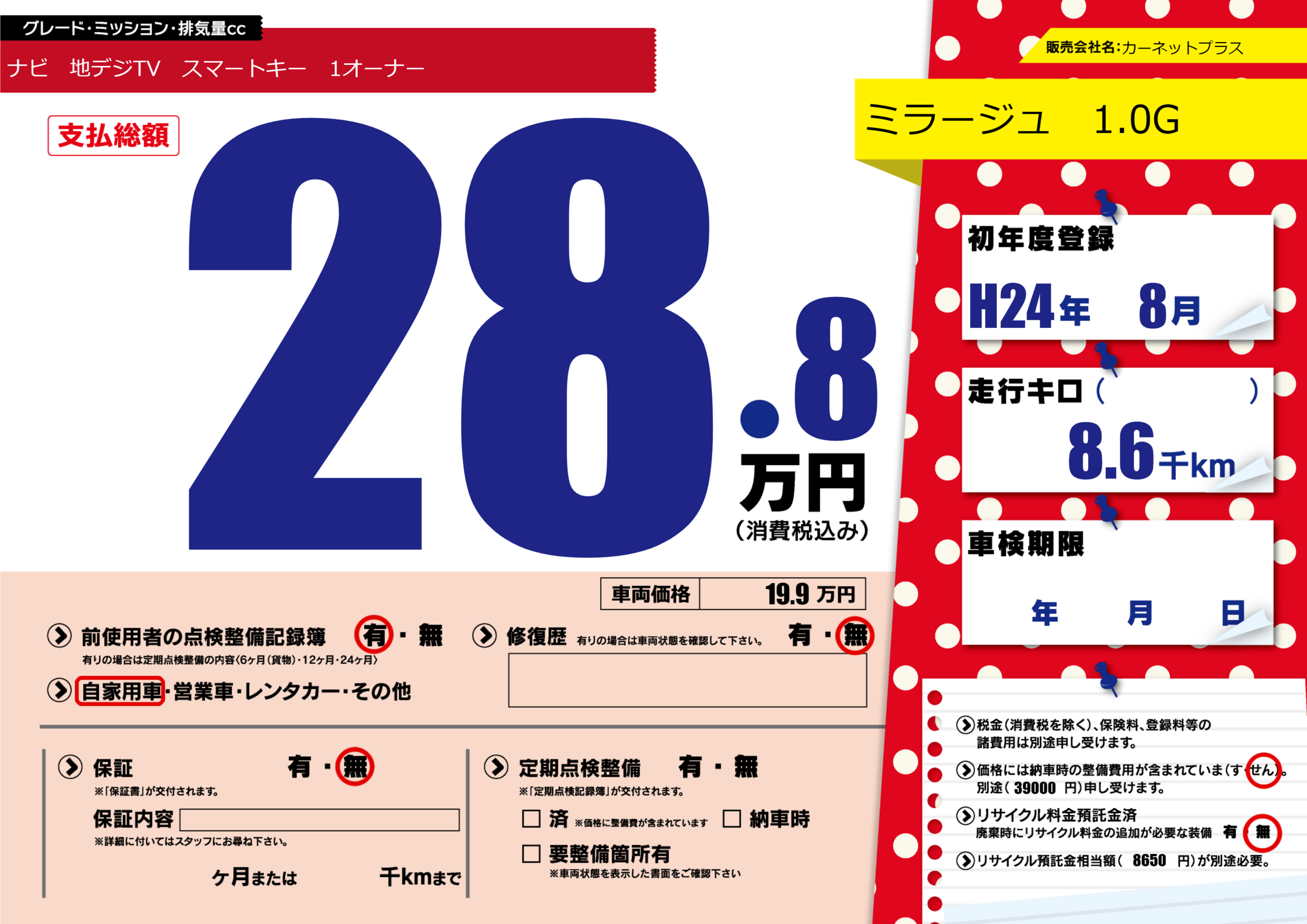 | 車名 | ミラージュ 1.0G | グレード ミッション 排気量 |