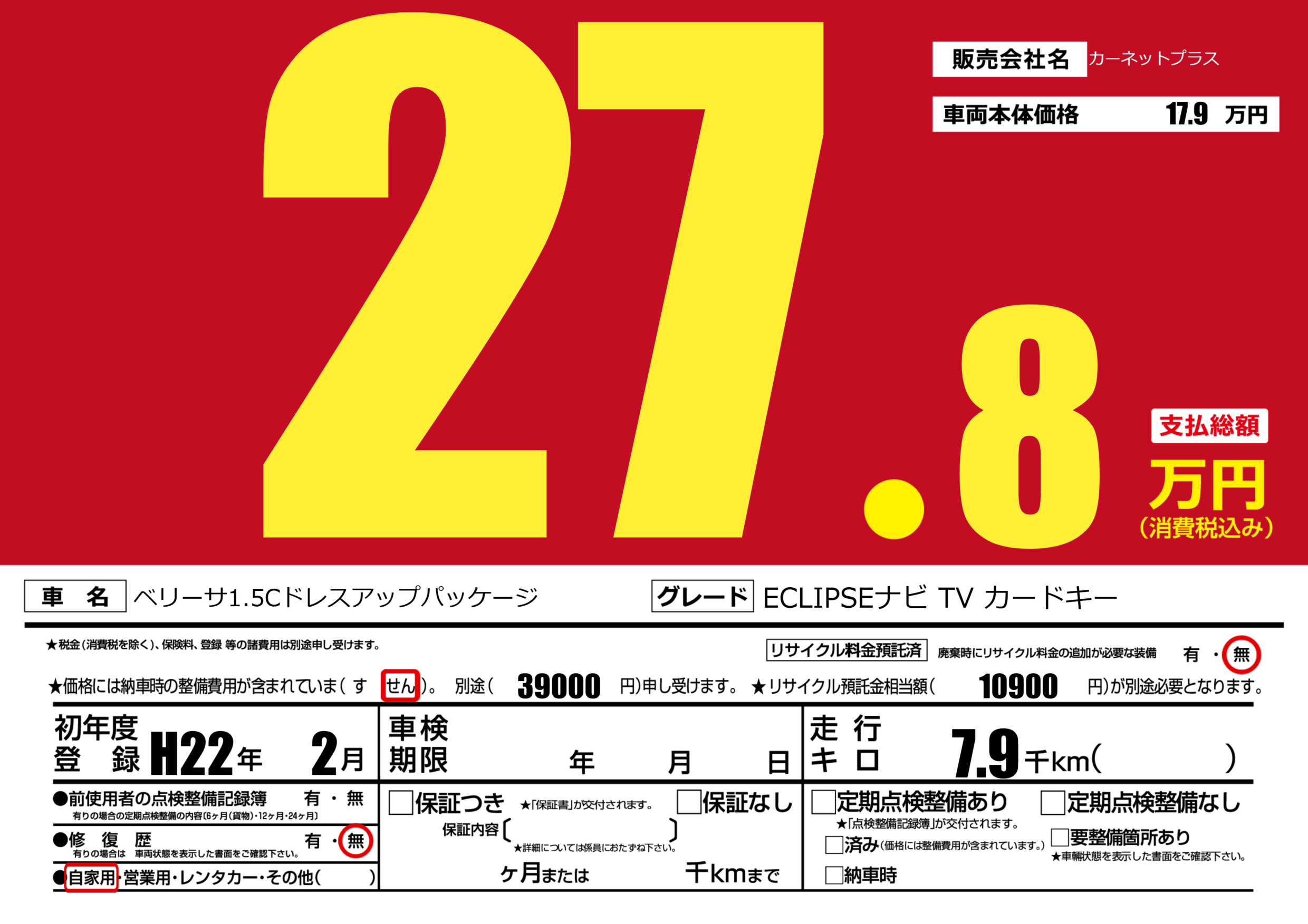 | 車名 | ベリーサ1.5Cドレスアップパッケージ | グレード ミッション 排気量 |