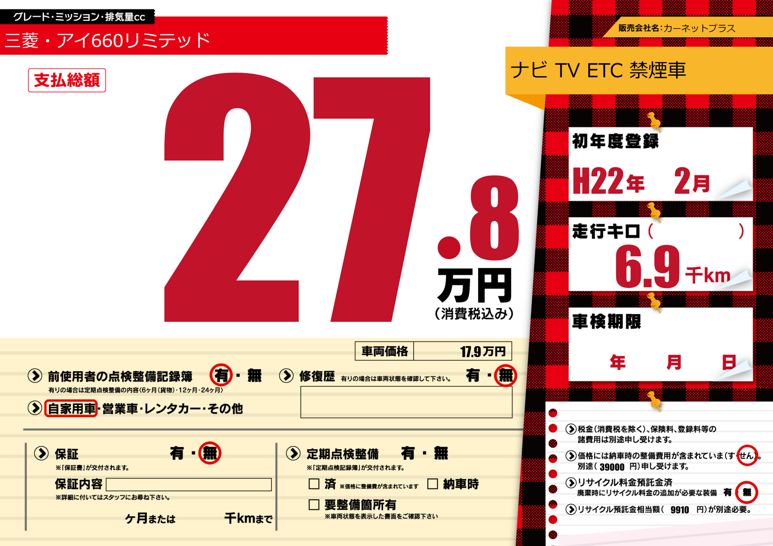 | 走行キロ | 0.6万km | 初年度登録 | H22年2月 |
