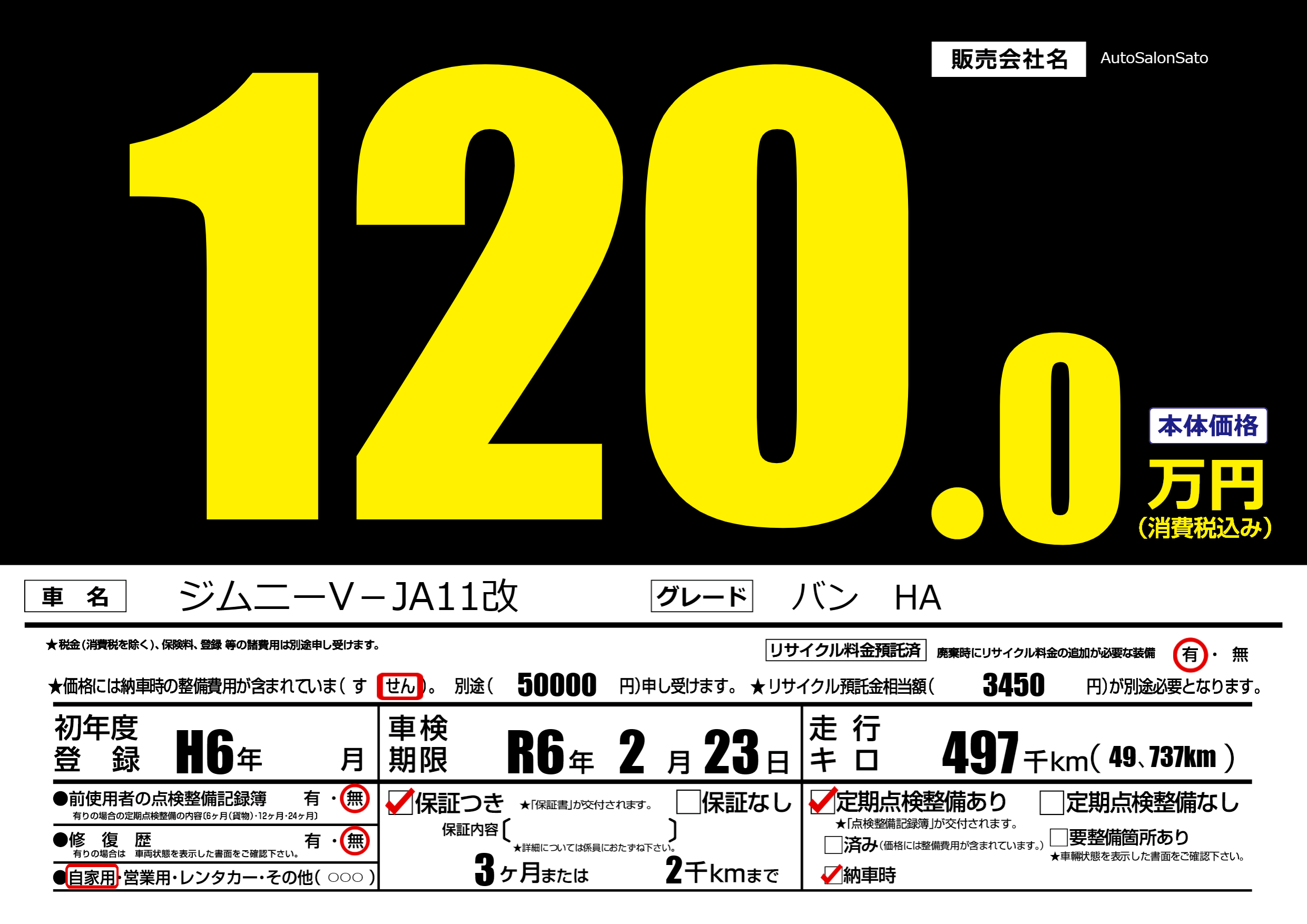 | 走行キロ | 49.7万km | 初年度登録 | H6年---月 |