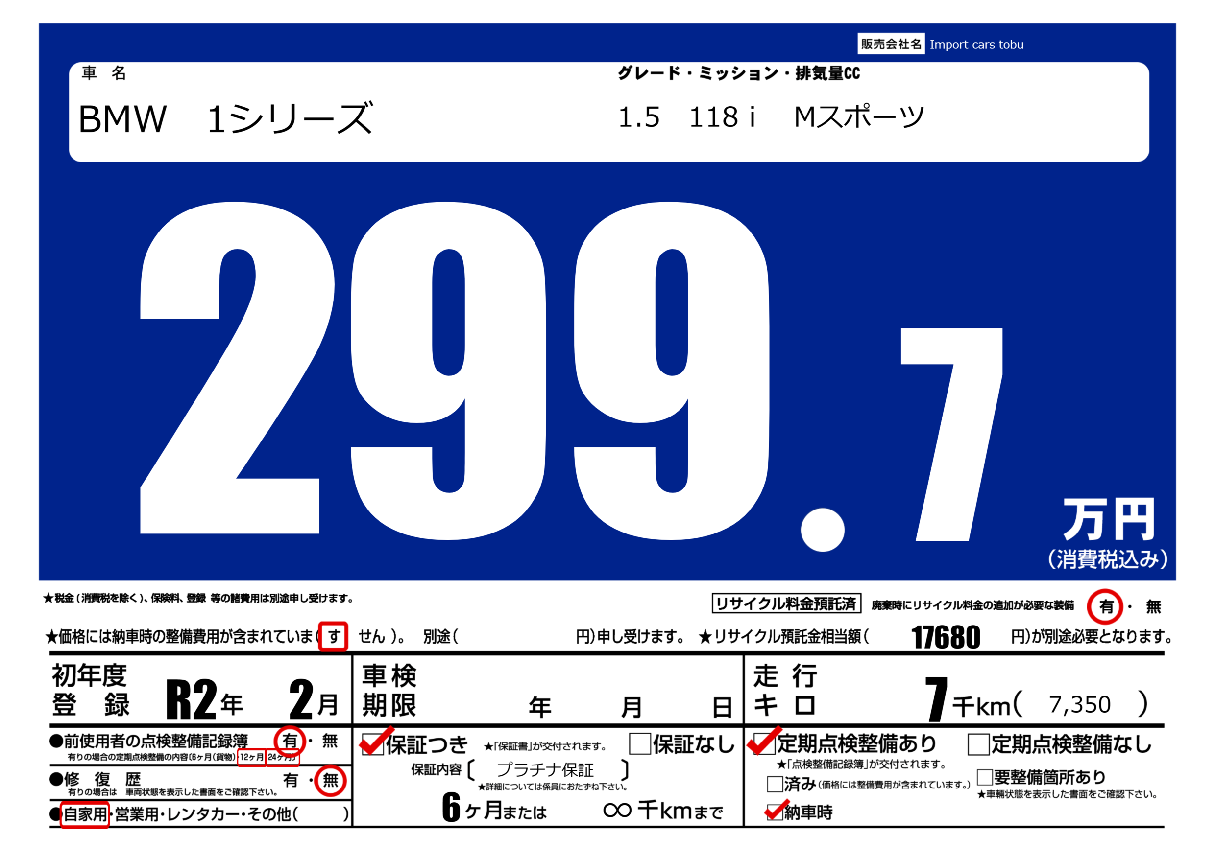 保証付き 保証内容( プラチナ保証) 6ヶ月または(∞)千kmまで |