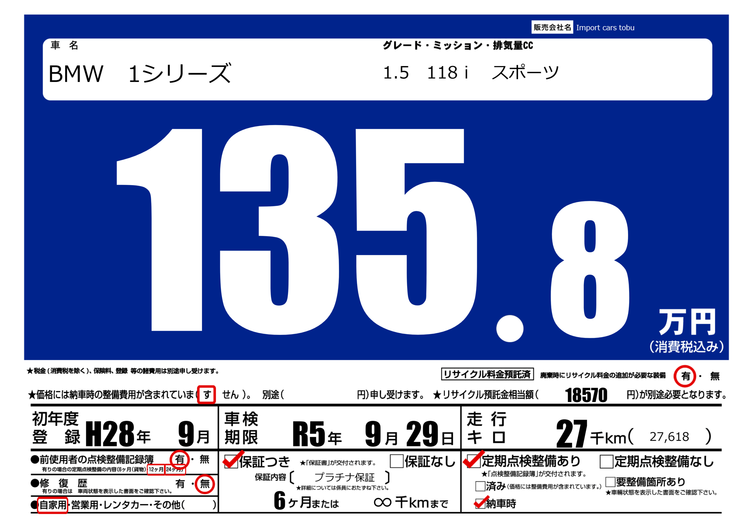 保証付き 保証内容( プラチナ保証) 6ヶ月または(∞)千kmまで |
