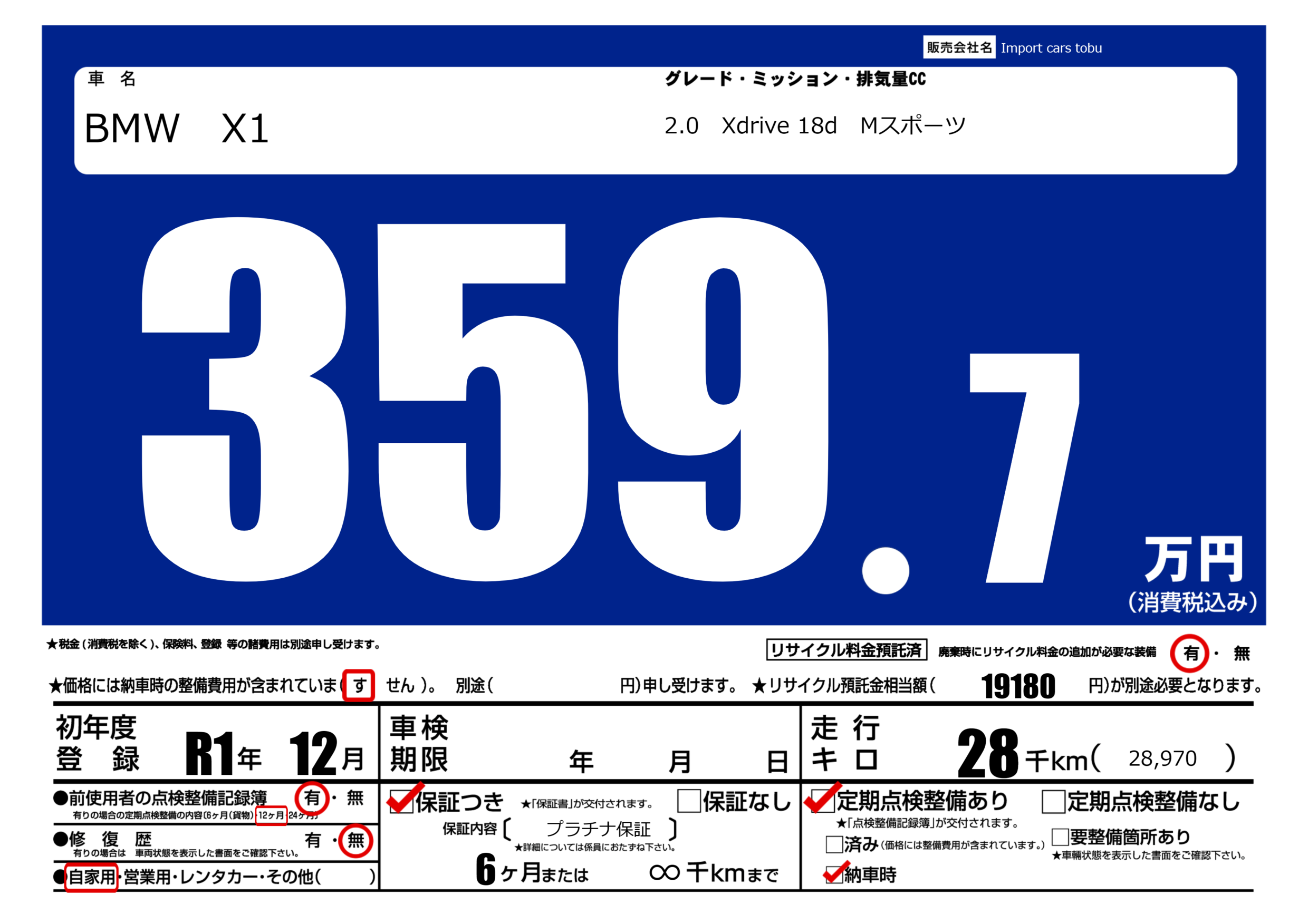 | 車名 | BMW X1 | グレード ミッション 排気量 |