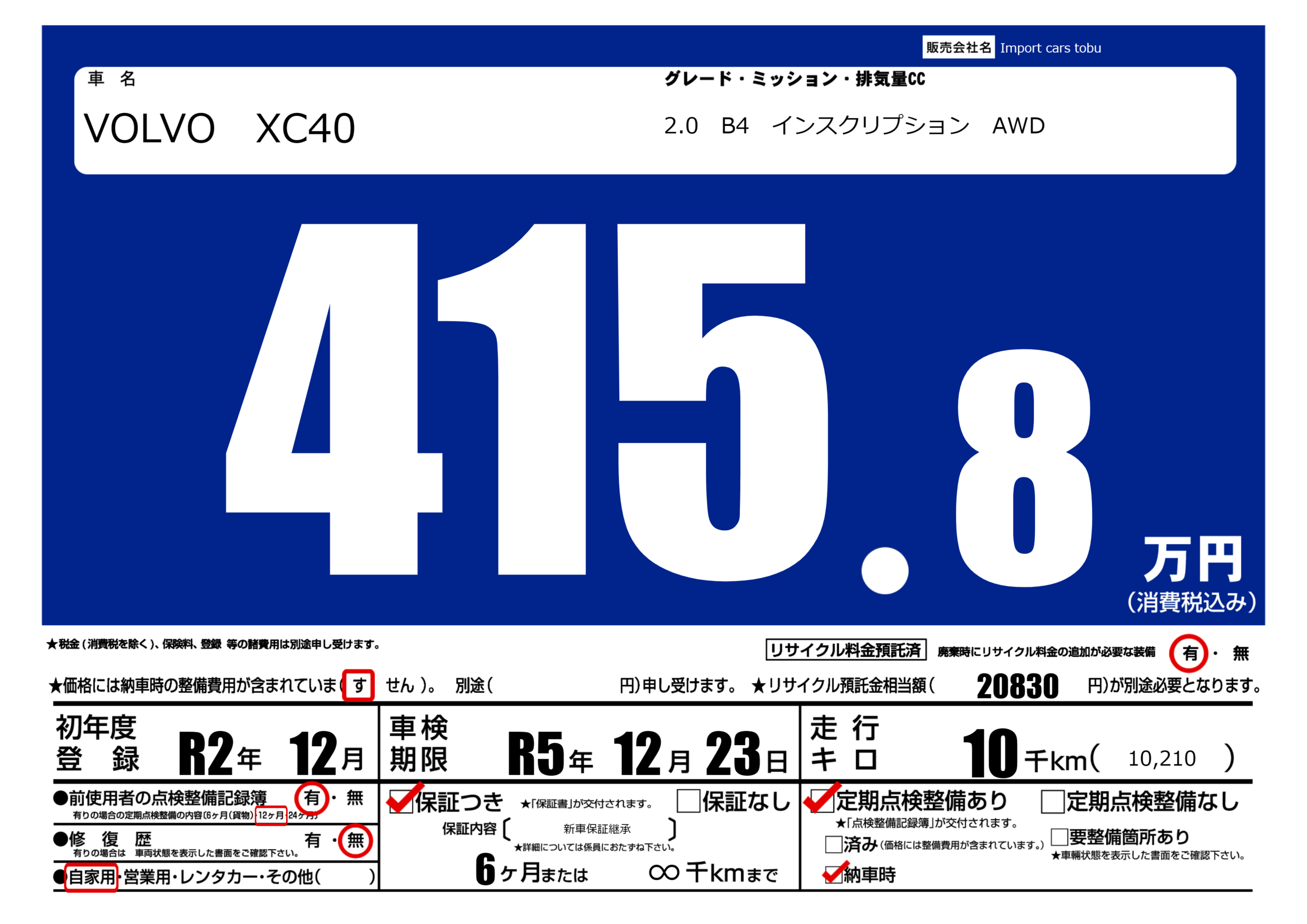 | 車名 | VOLVO XC40 | グレード ミッション 排気量 |