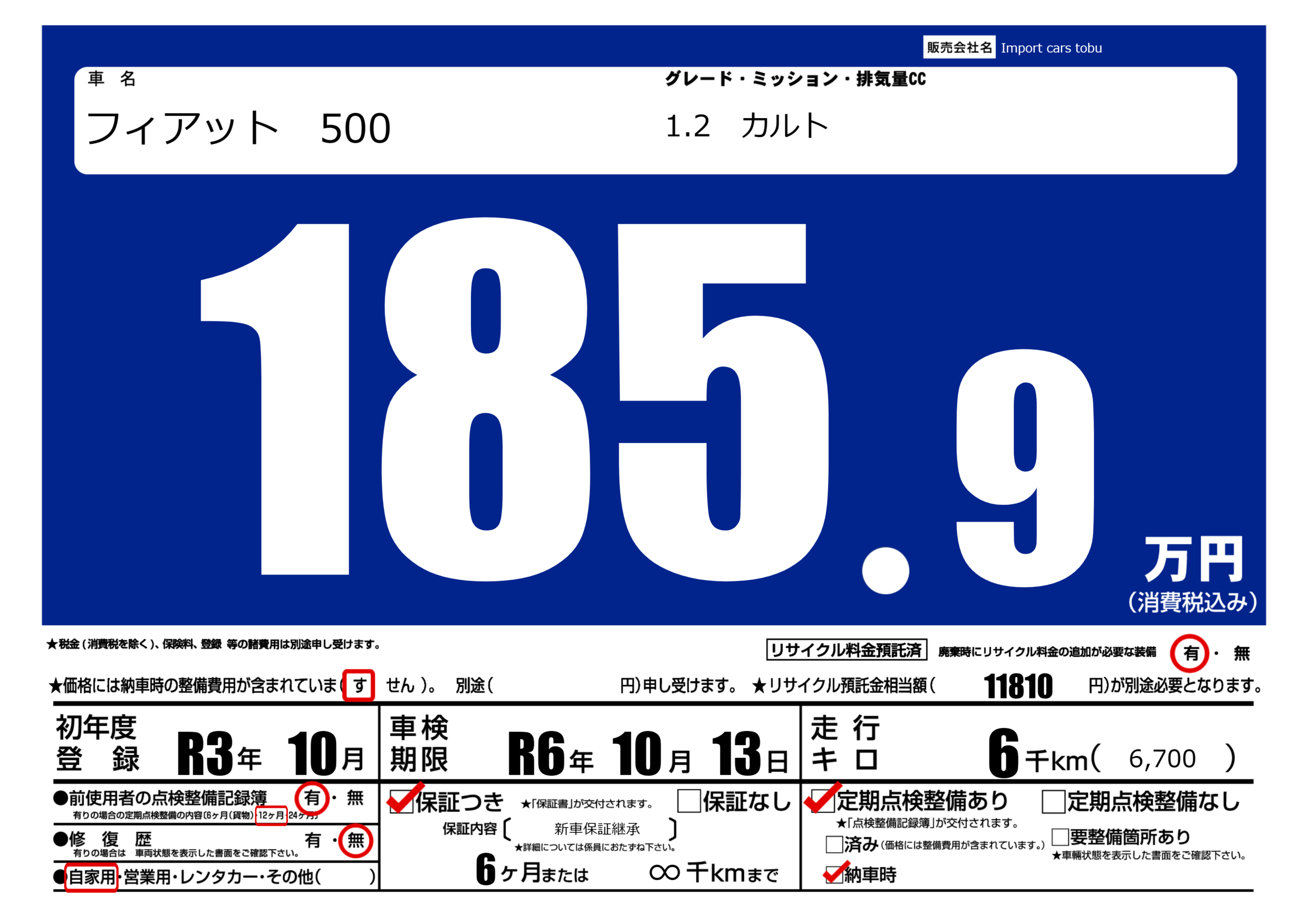 | 車名 | フィアット 500 | グレード ミッション 排気量 |