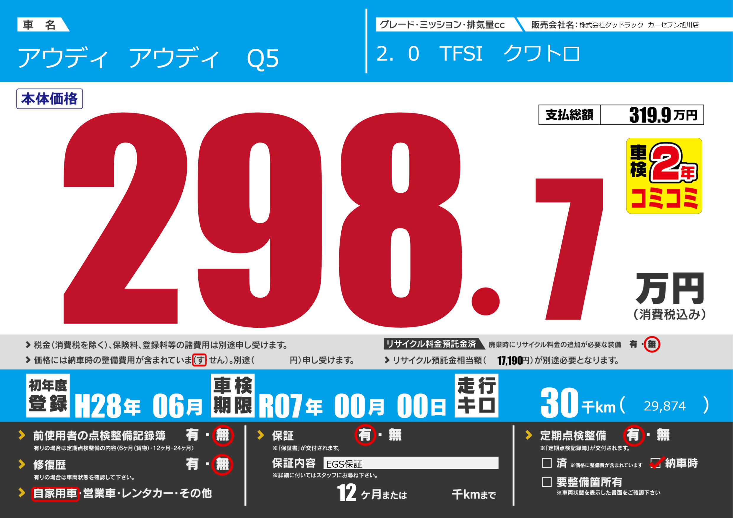 | 車名 | アウディ アウディ Q5 | グレード ミッション 排気量 |